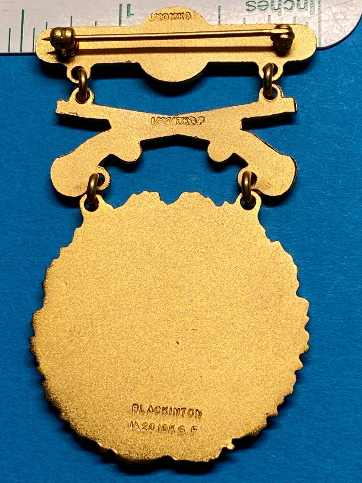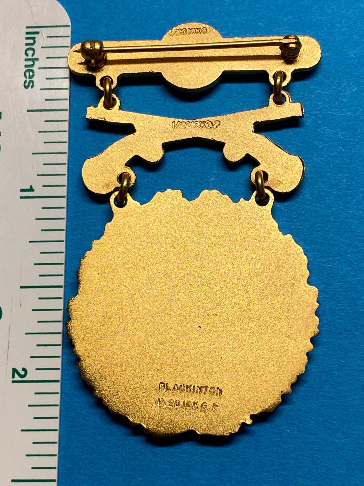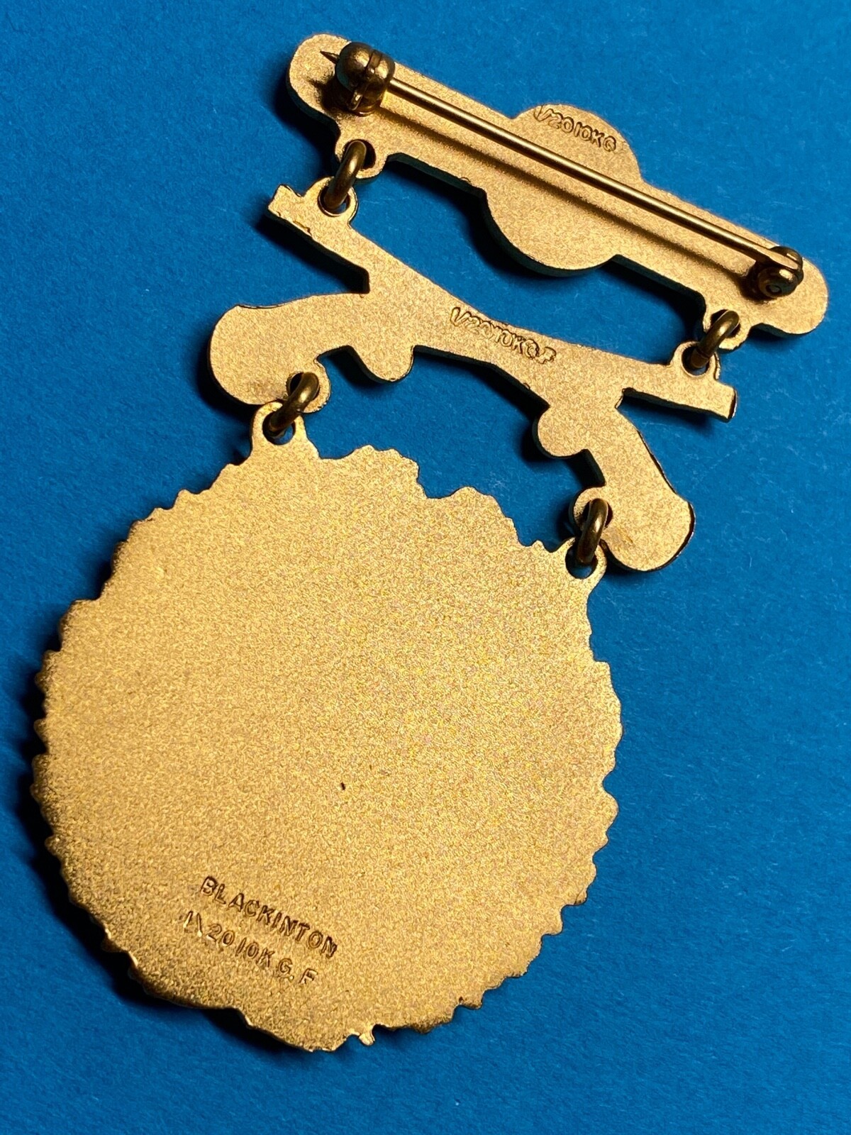 This is an original prototype made in 1958. Pinback with functional rotating clasp. The reverse is hallmarked (medal reverse) ? BLACKINTON, 1/20-10 KGF at the base of the medal; ?1/20 KGF? at the weapons intersection, and 1/20 KGF on the brooch. In some cases, the letter ?F? is hard to see. Unused, New Old Stock (NOS). Nice clean EIC badge/medal.