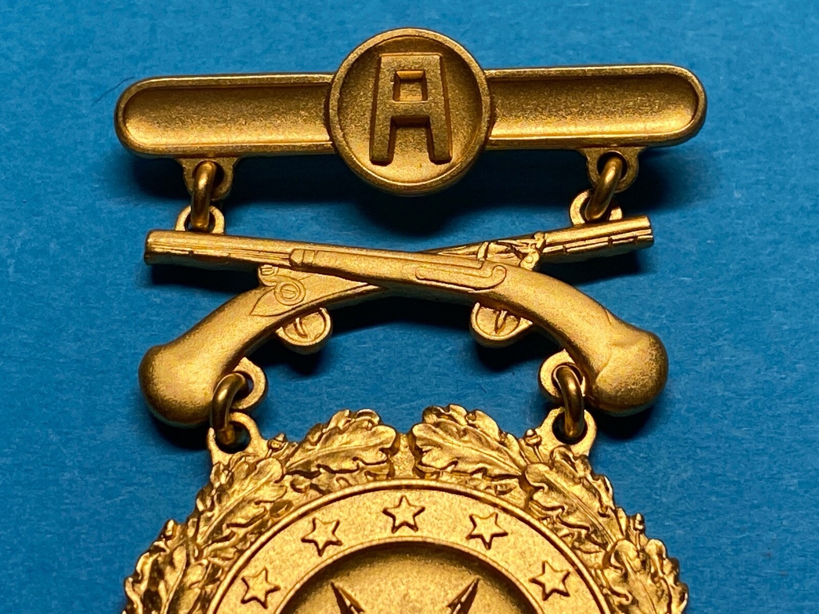 1950s prototype leg badges in gold, silver and bronze colors, both rifle and pistol. Each group was made with 9 different brooches: National matches, army wide matches, each CONUS army area, and Military District of Washington.