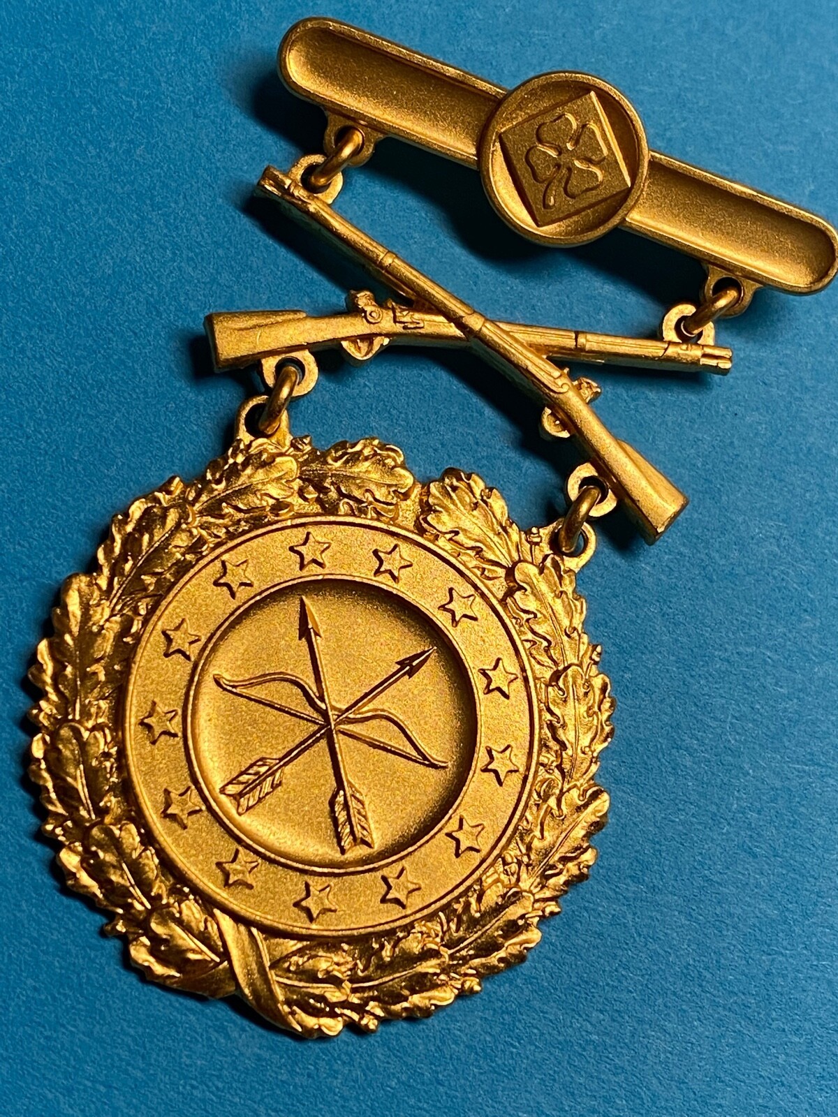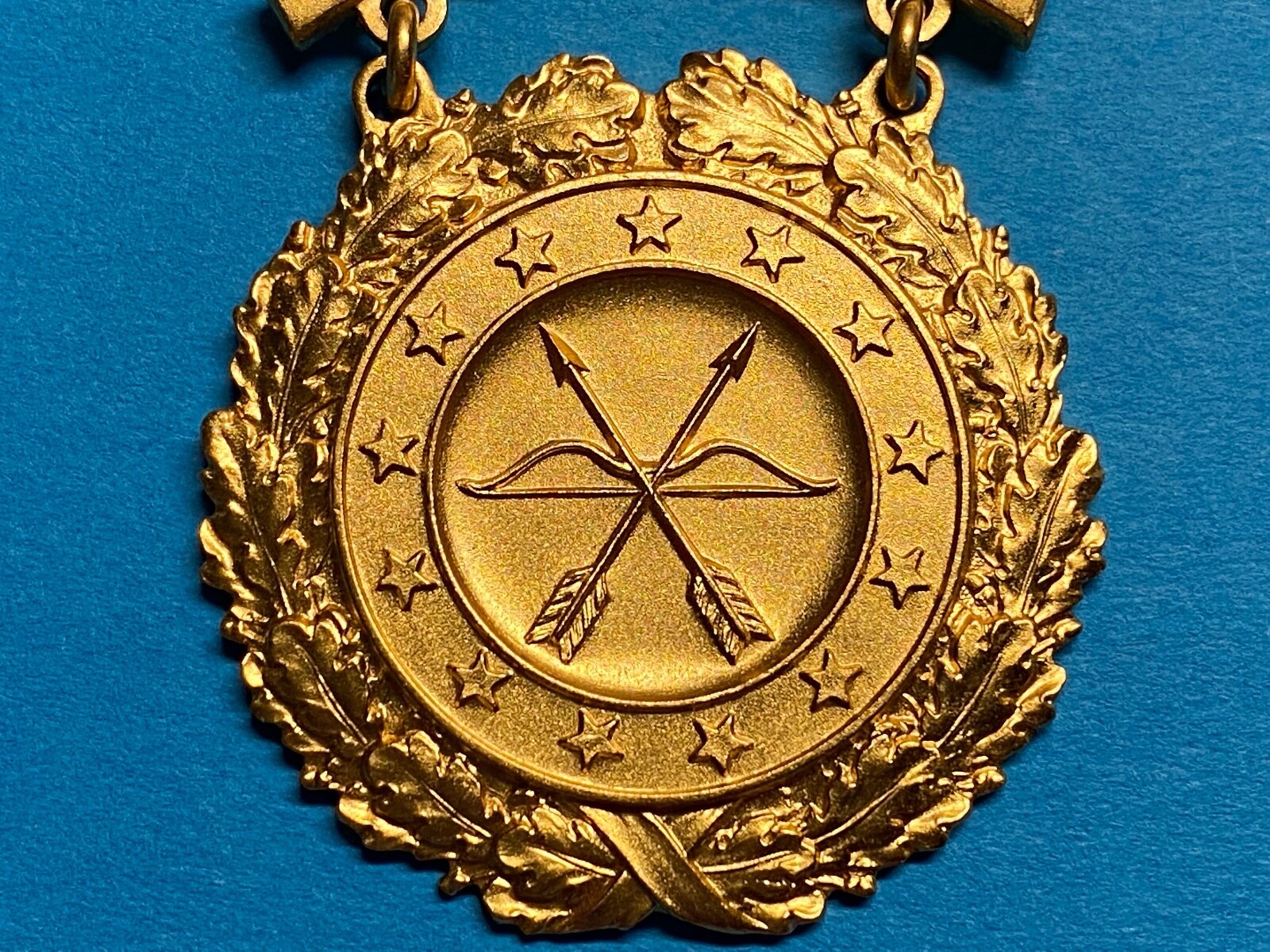1950s prototype leg badges in gold, silver and bronze colors, both rifle and pistol. Each group was made with 9 different brooches: National matches, army wide matches, each CONUS army area, and Military District of Washington.