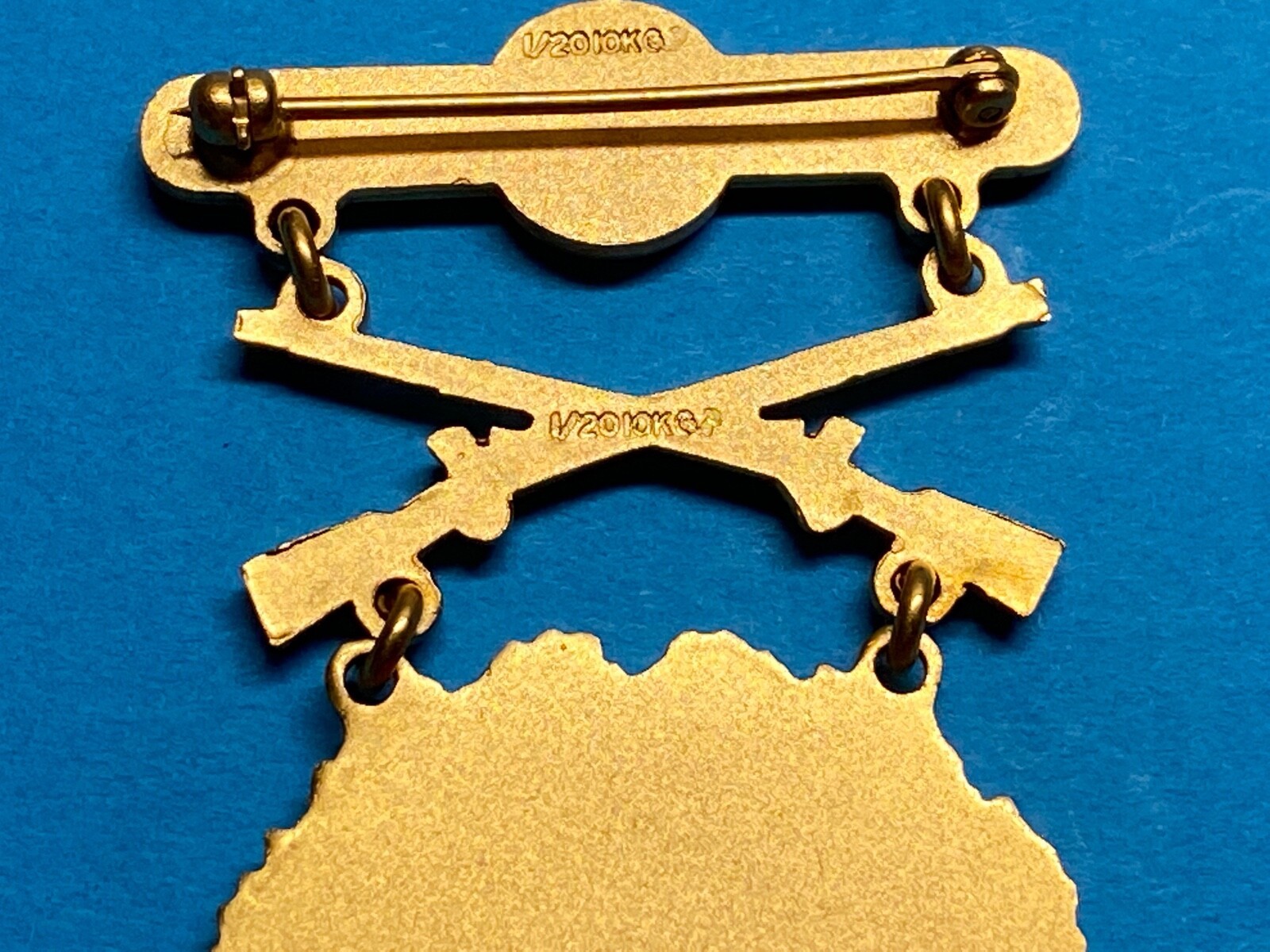 The easiest method to distinguish these clasps is by the markings or hallmarks on the reverse. Original gold-colored clasps dating from the World Wars are marked 14K on the reverse side butt or stock of the weapon. 1955 badges either are not marked (which allows for the false markings at this time) or are marked 1/20 KGF at the weapons intersection