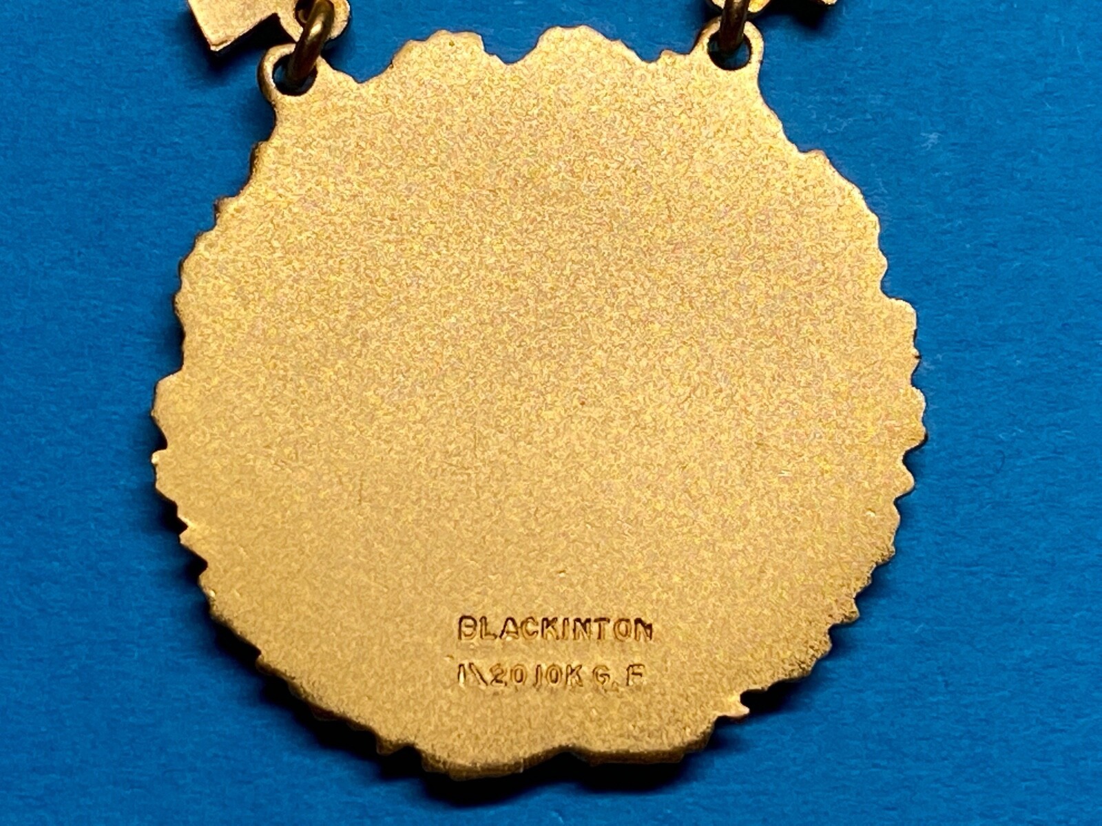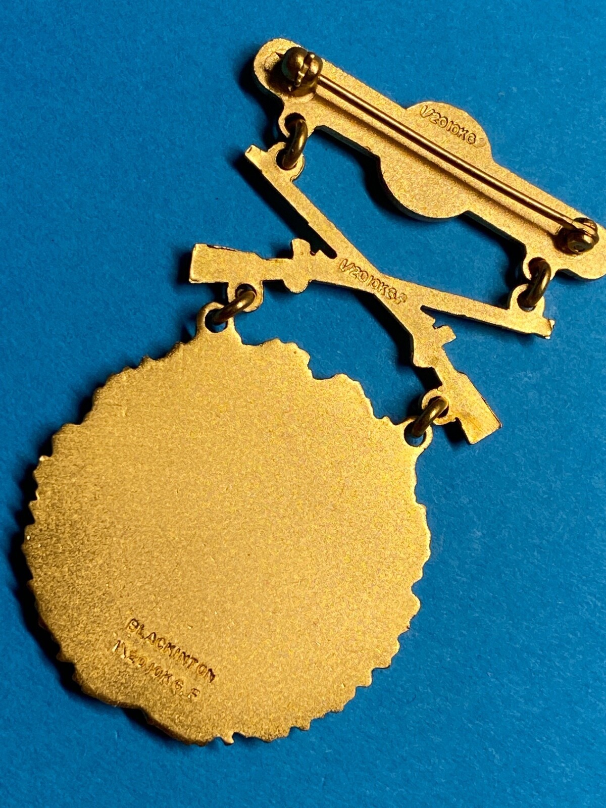 This is an original prototype made in 1958. Pinback with functional rotating clasp. The reverse is hallmarked (medal reverse) ? BLACKINTON, 1/20-10 KGF at the base of the medal; ?1/20 KGF? at the weapons intersection, and 1/20 KGF on the brooch. In some cases, the letter ?F? is hard to see. Unused, New Old Stock (NOS). Nice clean EIC badge/medal.