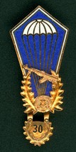 This is a vintage and original military issue Parachutist Qualification Badge from East Germany (Deutsche Demokratische Republik - DDR) with a #30 parachute jump hanger. It has a threaded screw post with dish shaped round spinner on the reverse for retention to the uniform. This Para badge is illustrated in Bragg Turner's first book, Parachute Badges and Insignia of the World, as B T# 744.