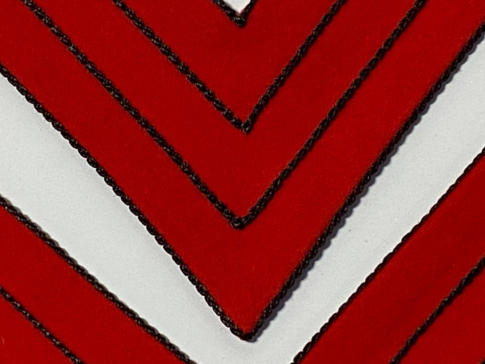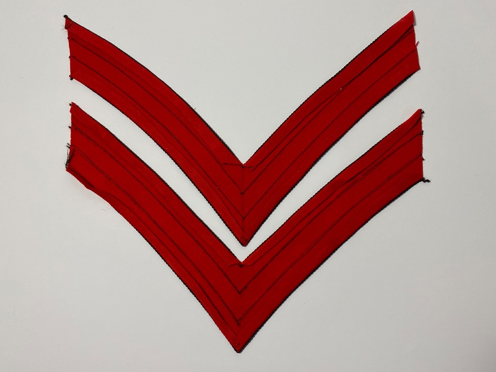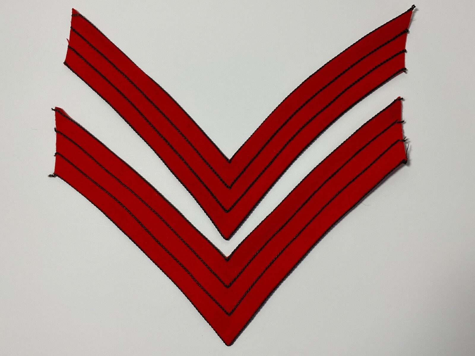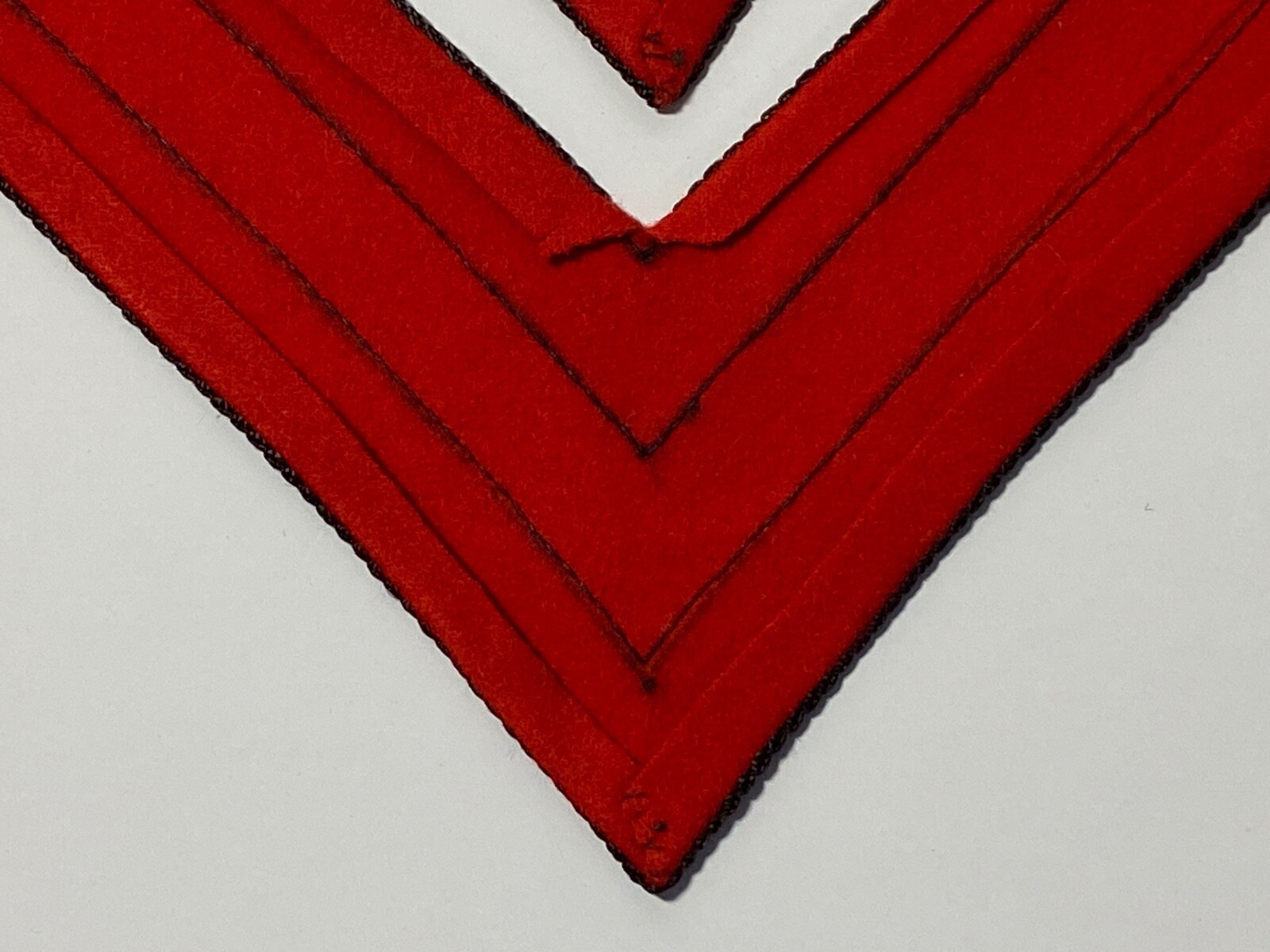 Scarlet wool construction with black chain stitching along the borders. These appear to be unused. There is no evidence of use, age, and no moth damage. This matched set of chevrons were worn during the Spanish American War and Indian Wars. Matched set.