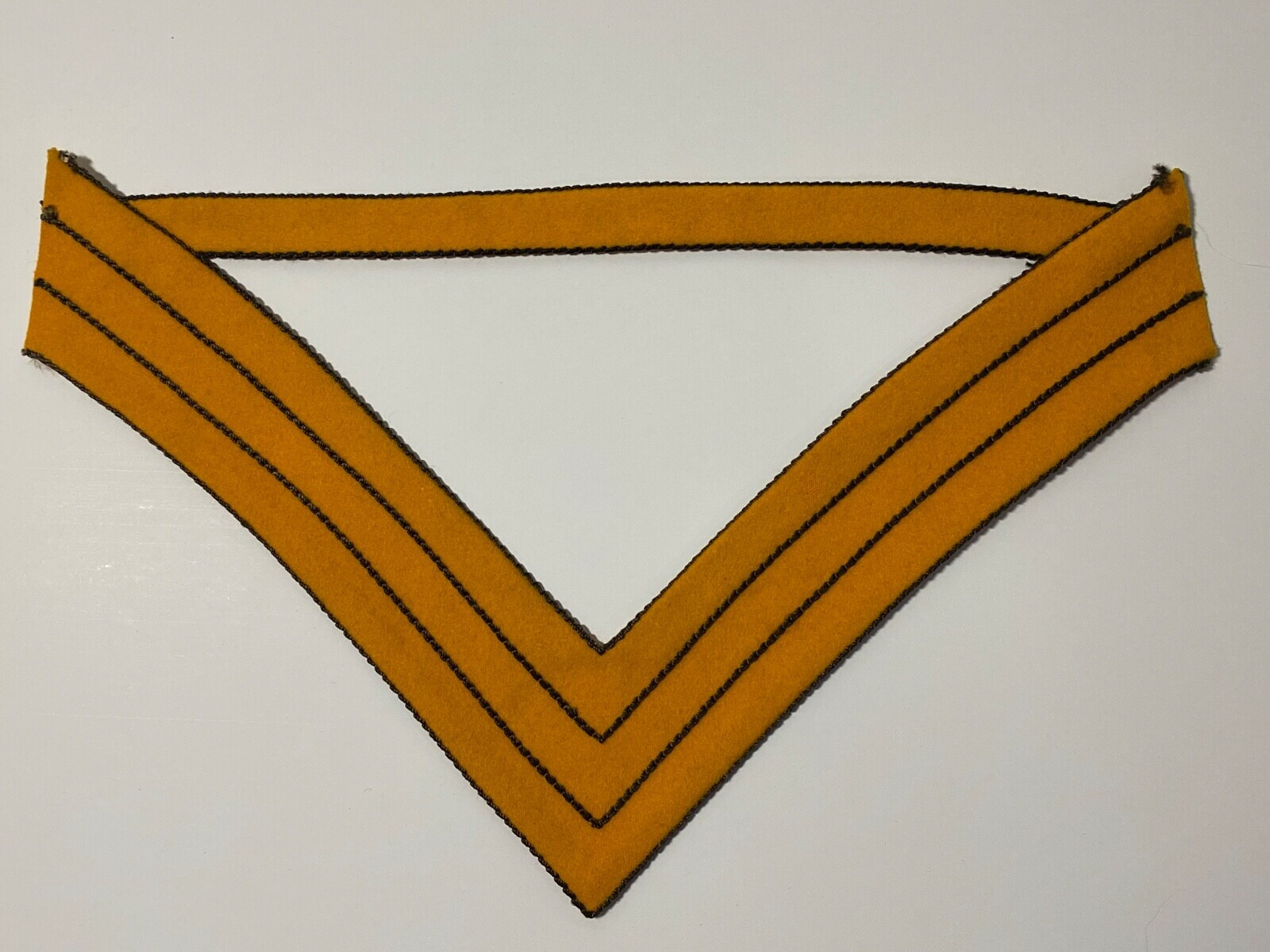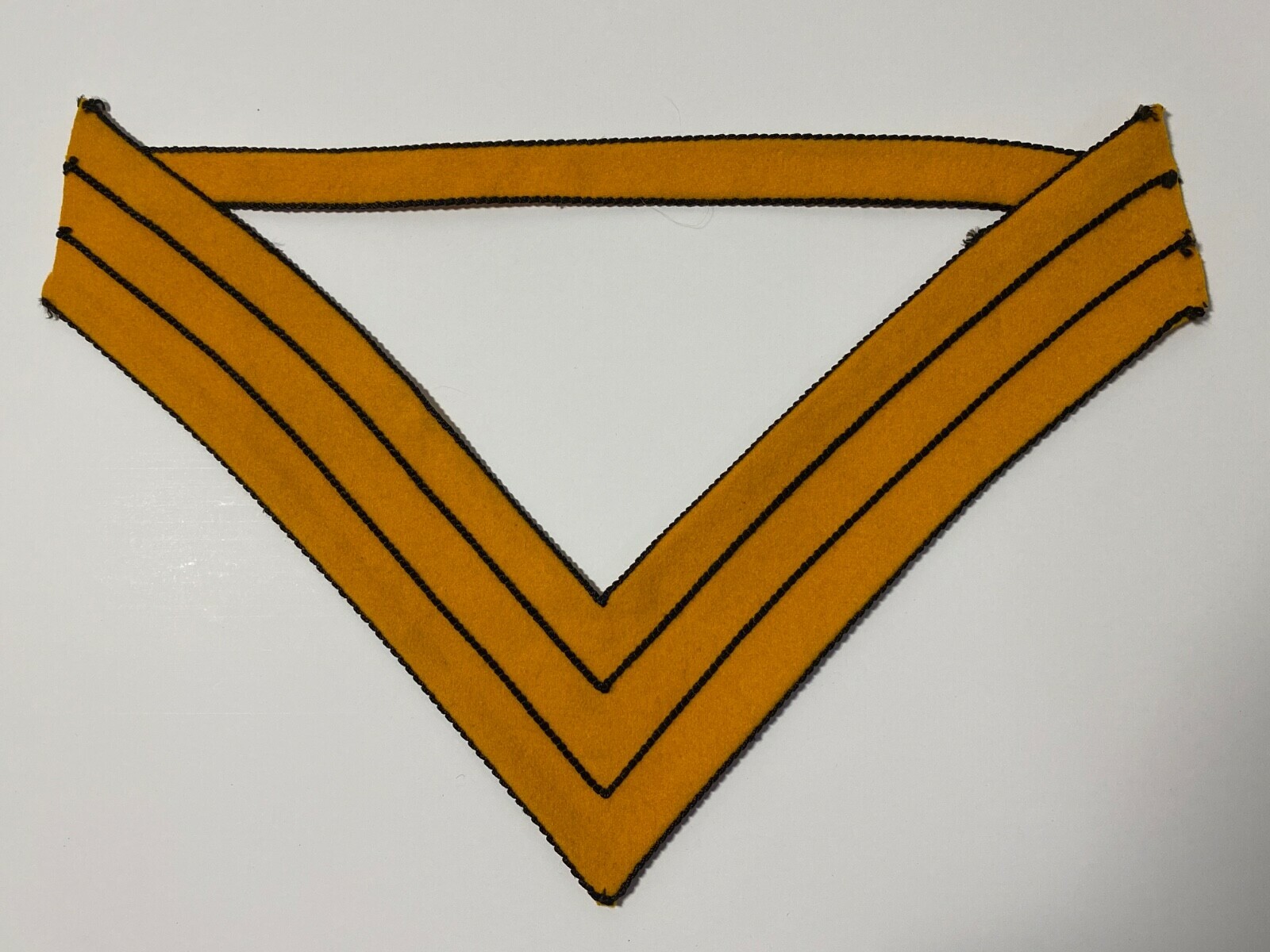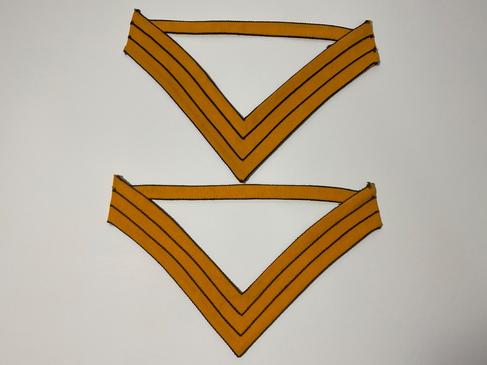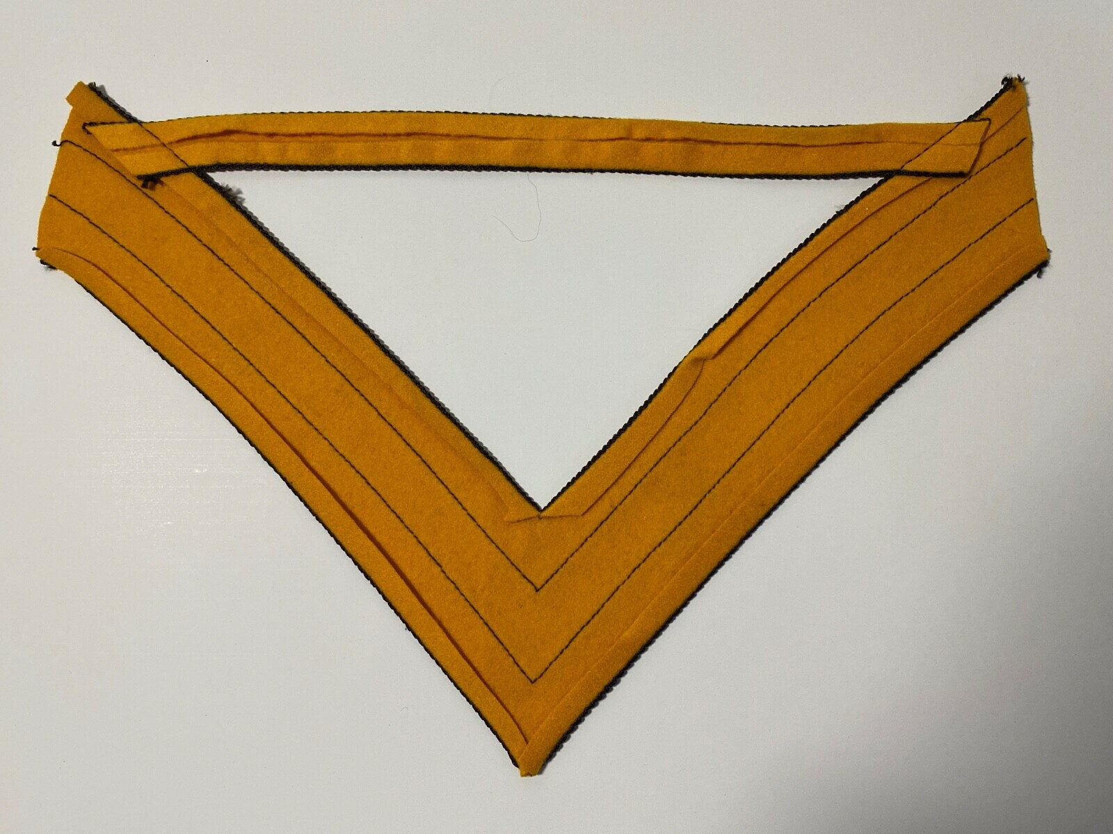 Yellow wool construction with black chain stitching along the borders. These appear to be unused. There is no evidence of use, age, and no moth damage. This matched set of chevrons were worn during the Spanish American War and Indian Wars. These were short lived between 1901-1902. Matched set.