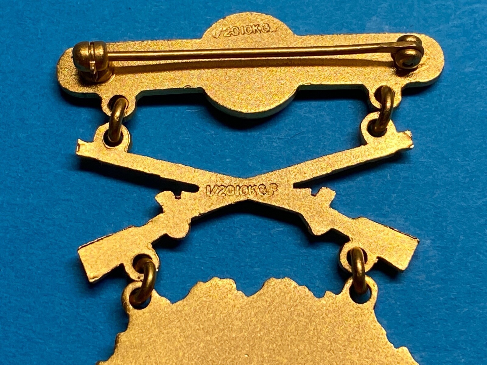 The easiest method to distinguish these clasps is by the markings or hallmarks on the reverse. Original gold-colored clasps dating from the World Wars are marked 14K on the reverse side butt or stock of the weapon. 1955 badges either are not marked (which allows for the false markings at this time) or are marked 1/20 KGF at the weapons intersection