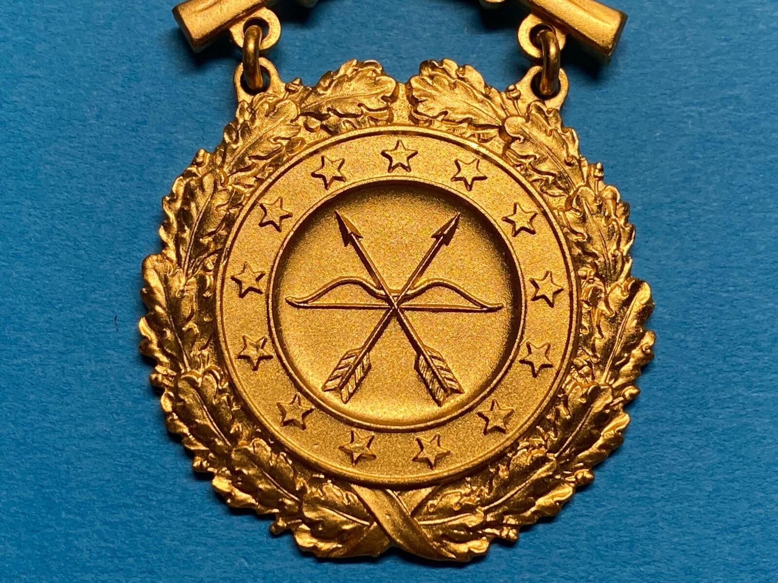1950s prototype leg badges in gold, silver and bronze colors, both rifle and pistol. Each group was made with 9 different brooches: National matches, army wide matches, each CONUS army area, and Military District of Washington.
