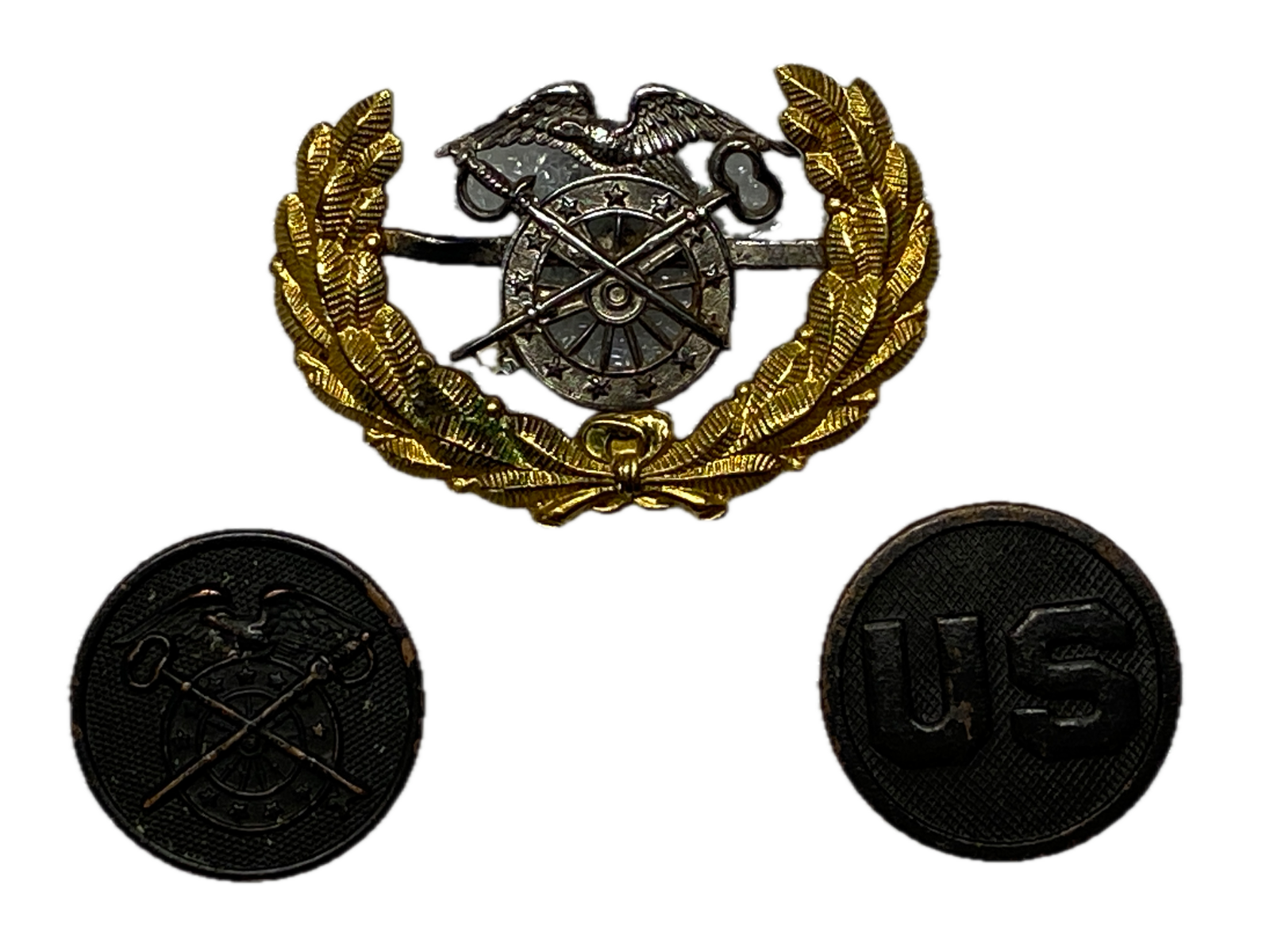 CIRCA 1905-1918, QUARTERMASTER, ENLISTED, FORAGE CAP BADGE AND COLLAR DISKS, COMPLETE SET FOR ENLISTED