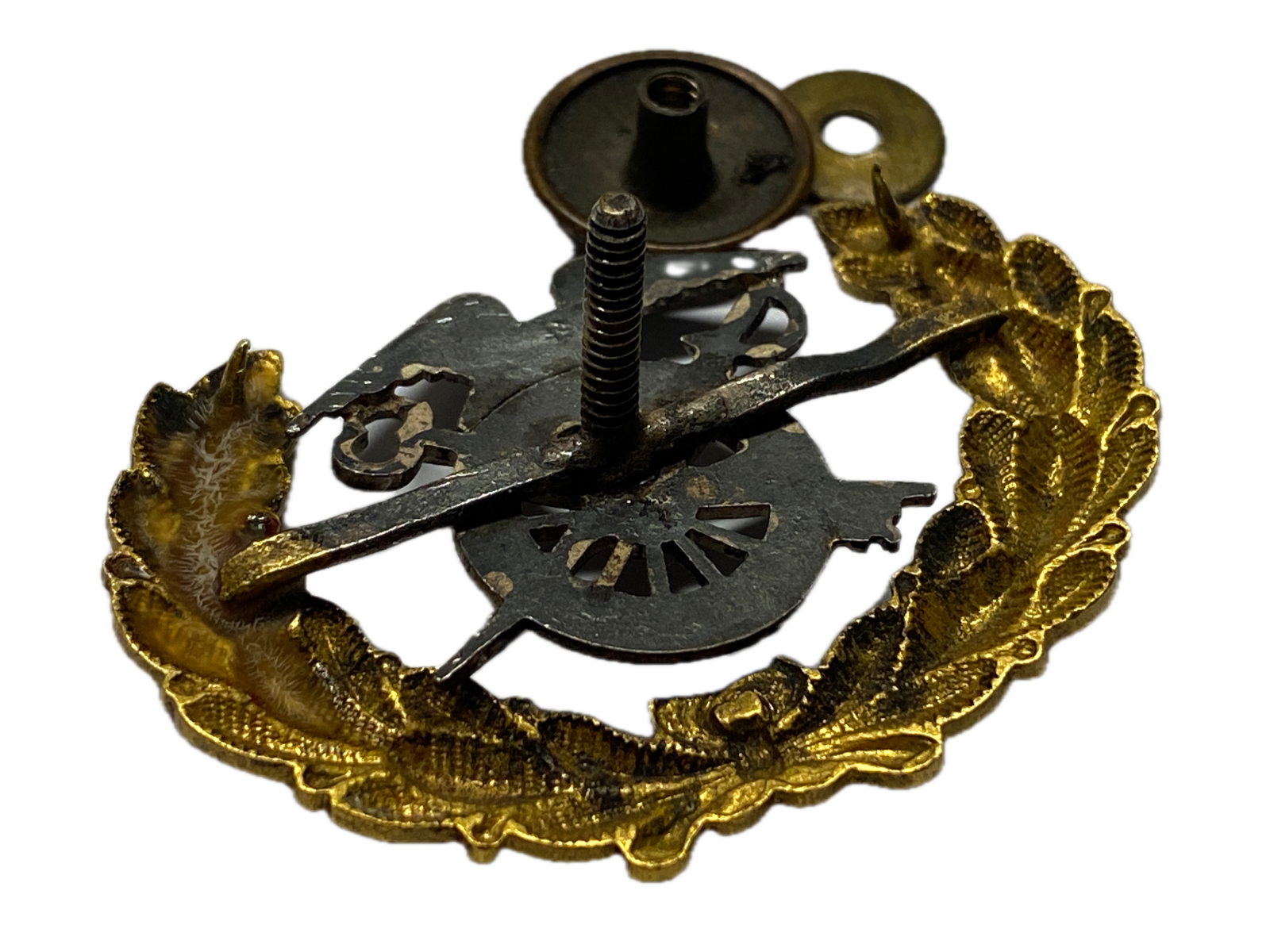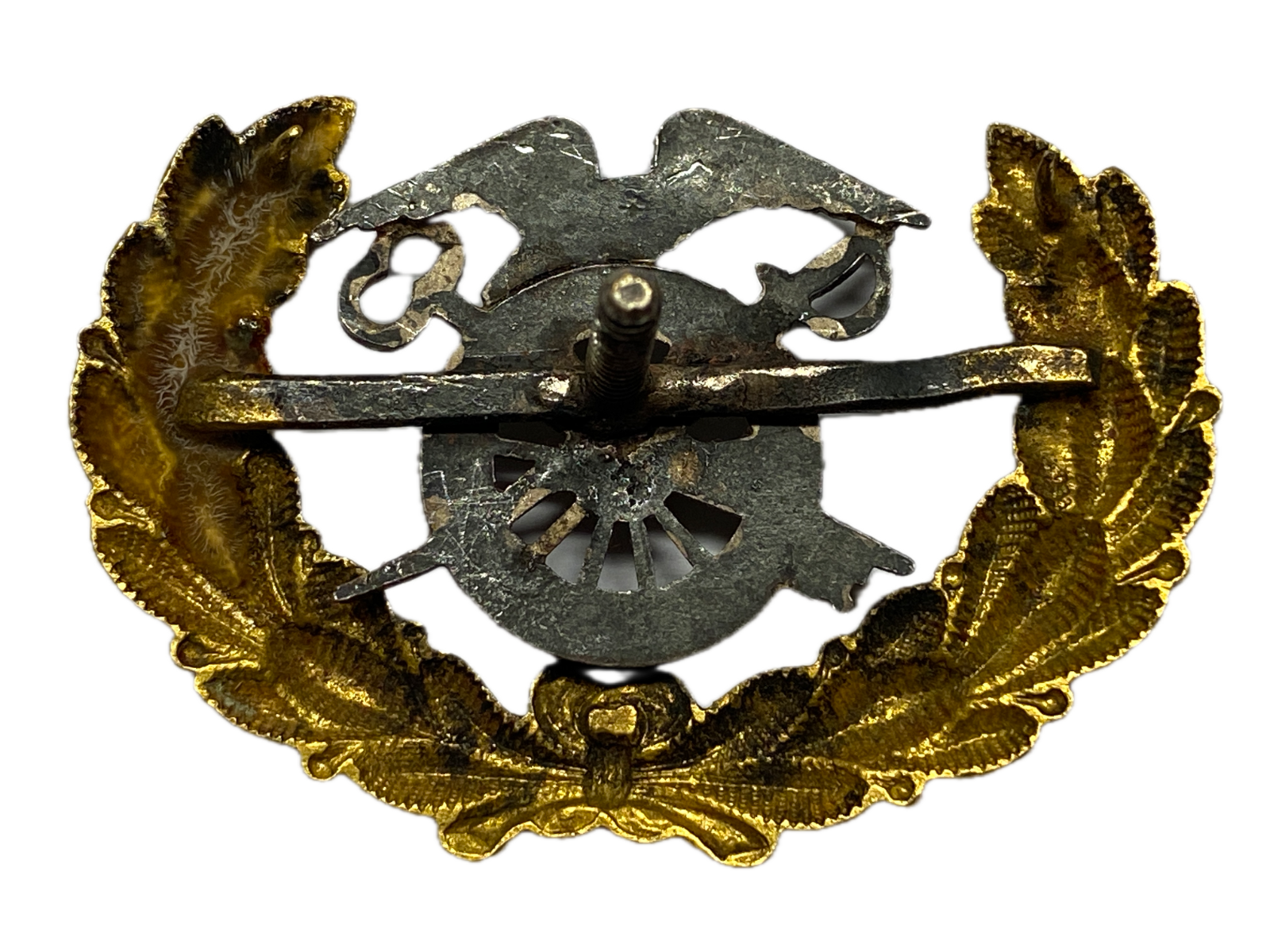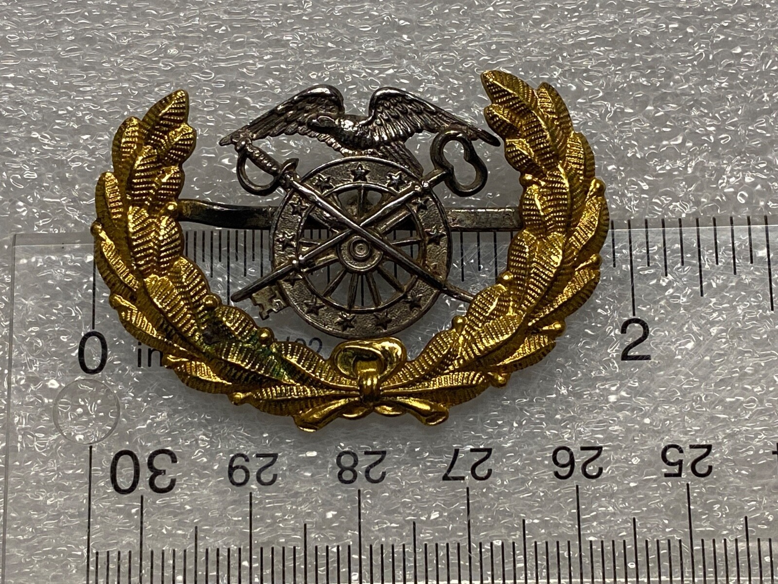 Forage Cap Badge: Enlisted. Gilt wreath, Silver toned Quartermaster insignia supported by a center bar. Screw back. Take note of the smaller size of the wreath. General Orders Number 197, dated 31 December 1904, reduced the size of the enlisted hat badges. This is one of those in reduced size. These were worn by post quartermaster sergeants until 1913, when they were adopted by noncommissioned officers for the newly formed Quartermaster Corps.