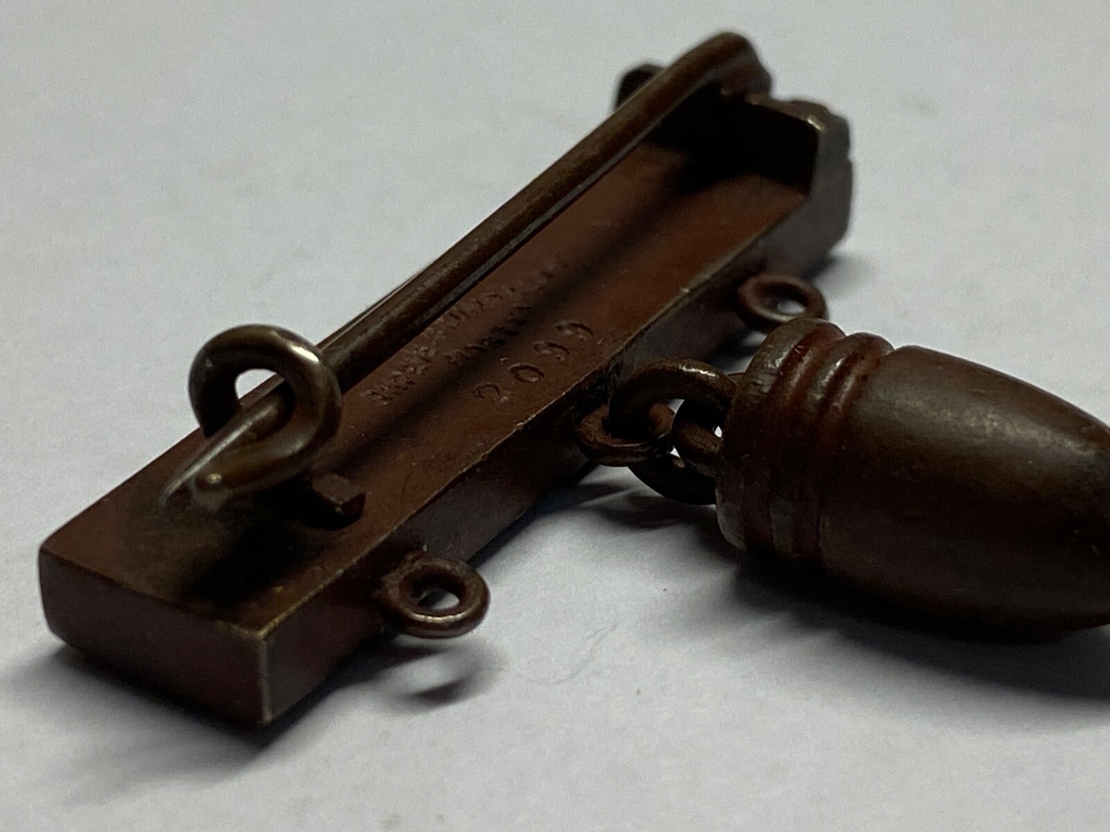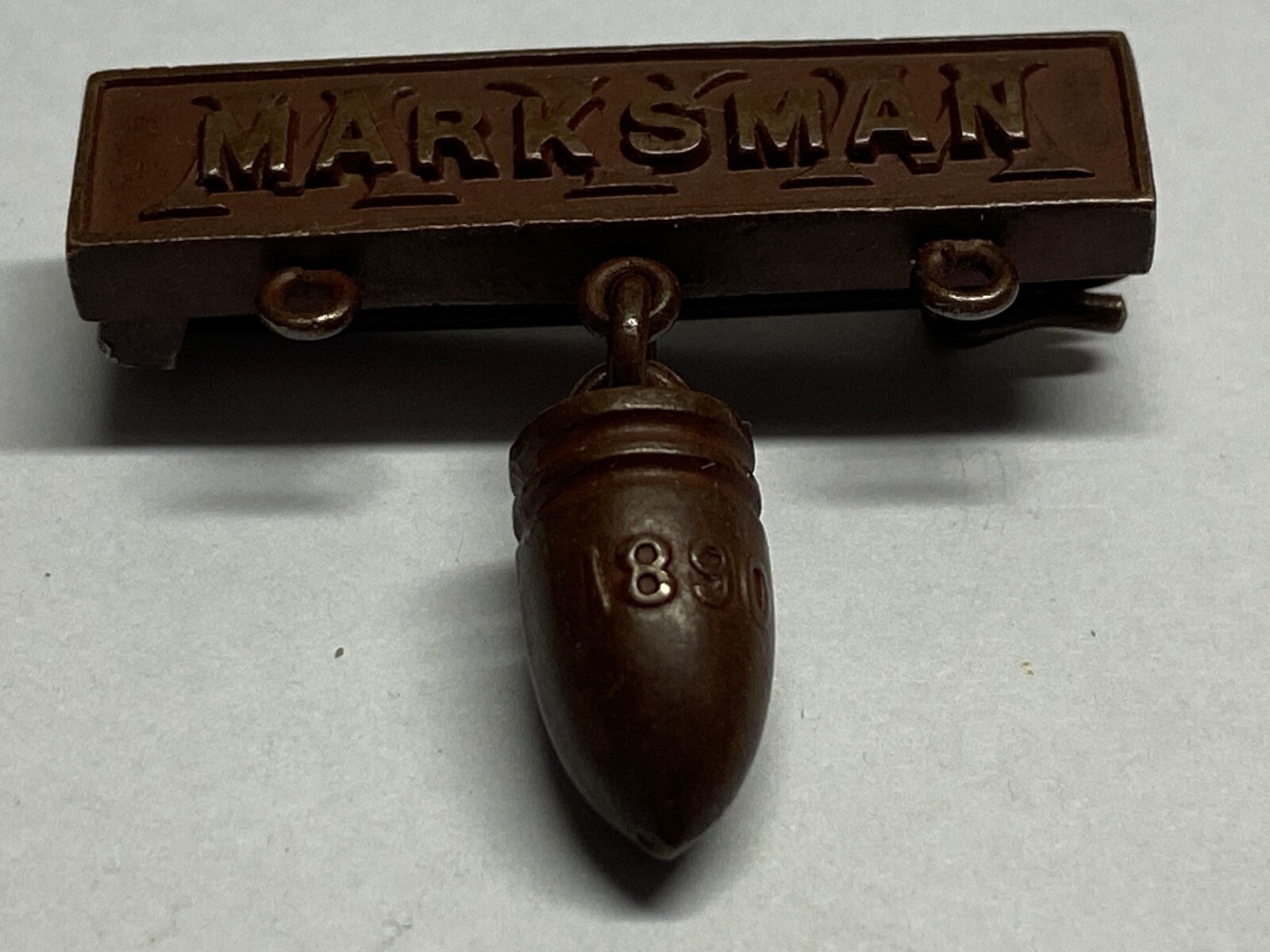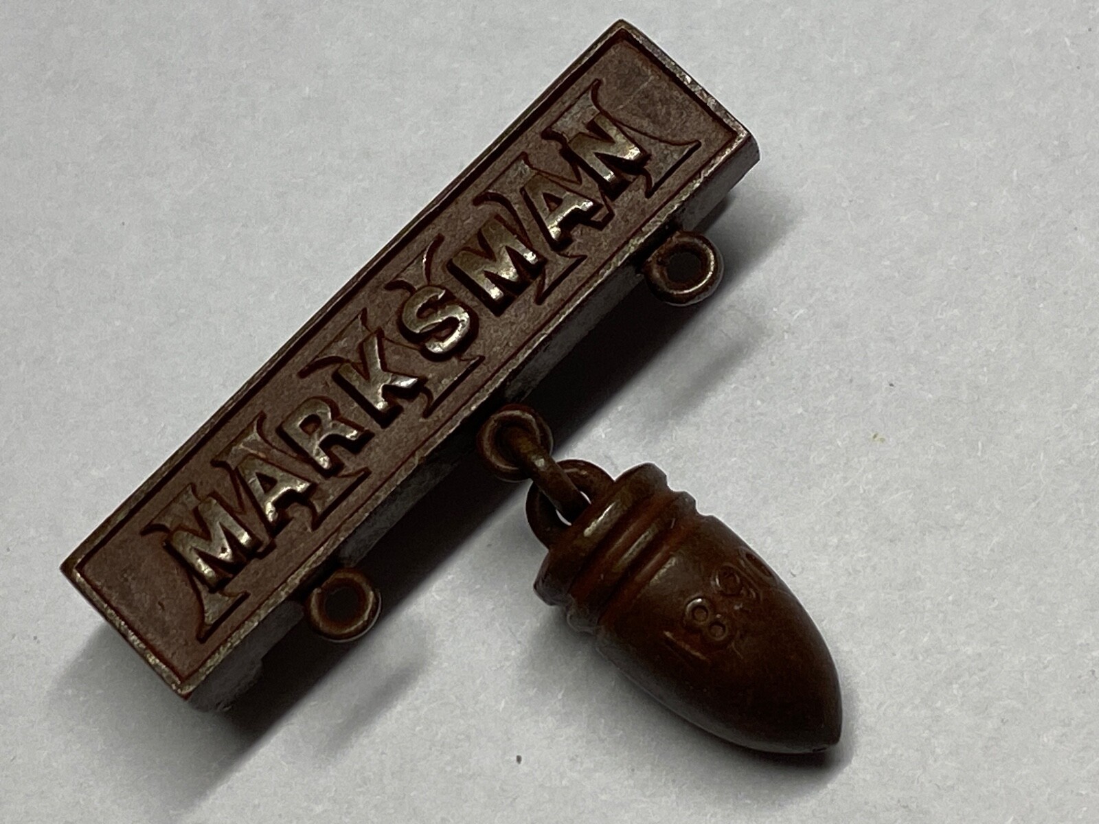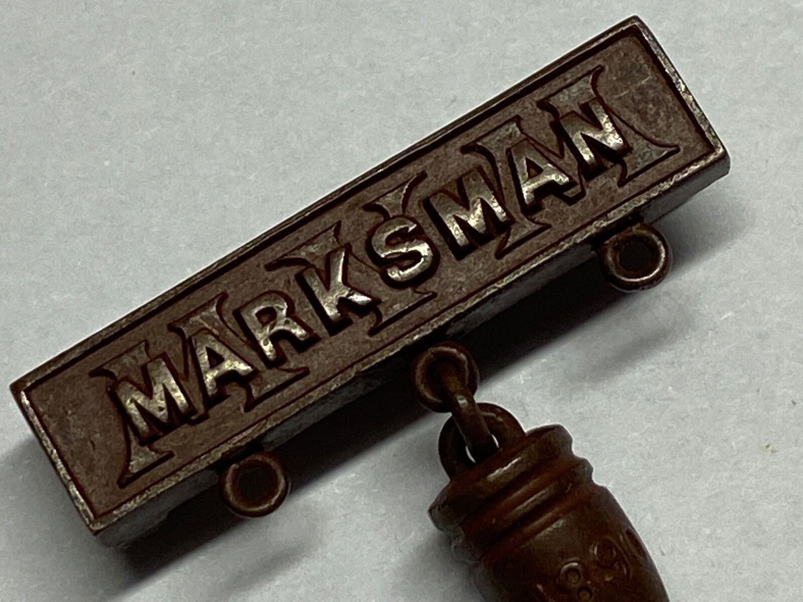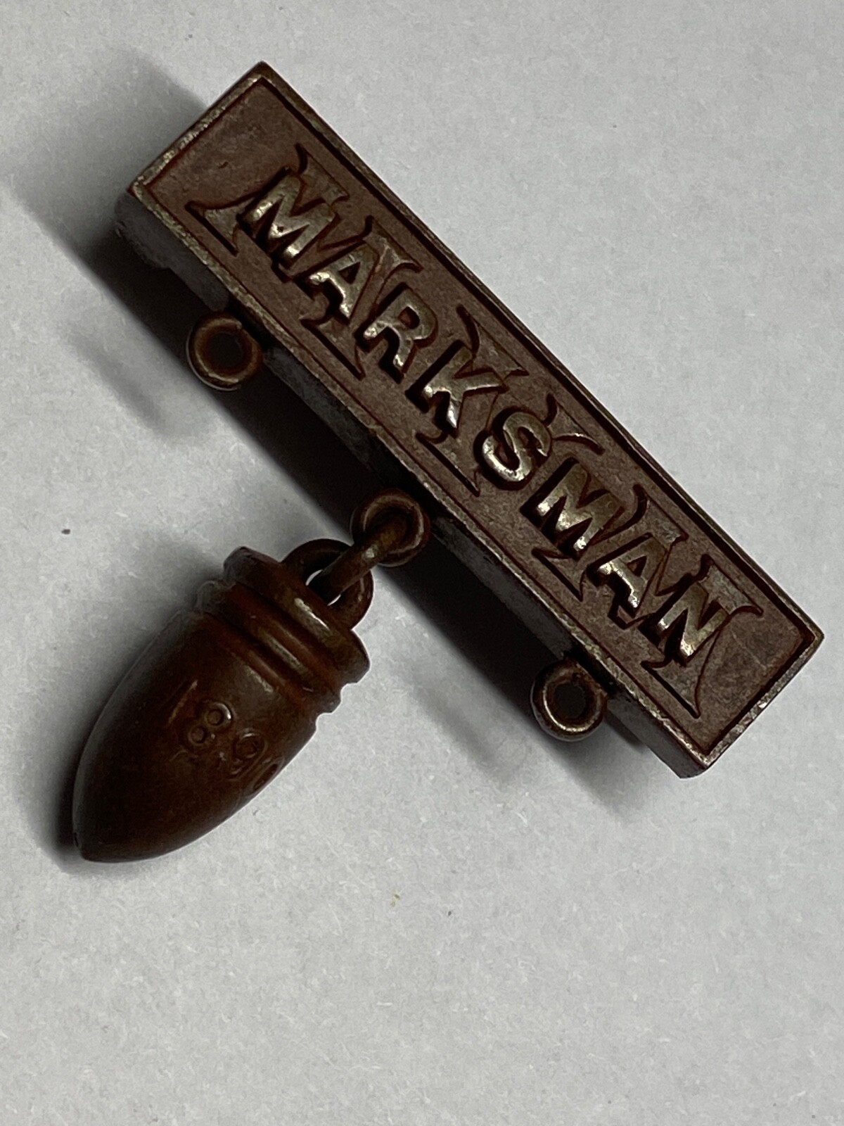?The marksman badge is a bronze bar bearing the word "MARKSMAN" covering the letters MVM. To this is hung a bullet of the same material as the bar, upon which is the year for which the badge is conferred"