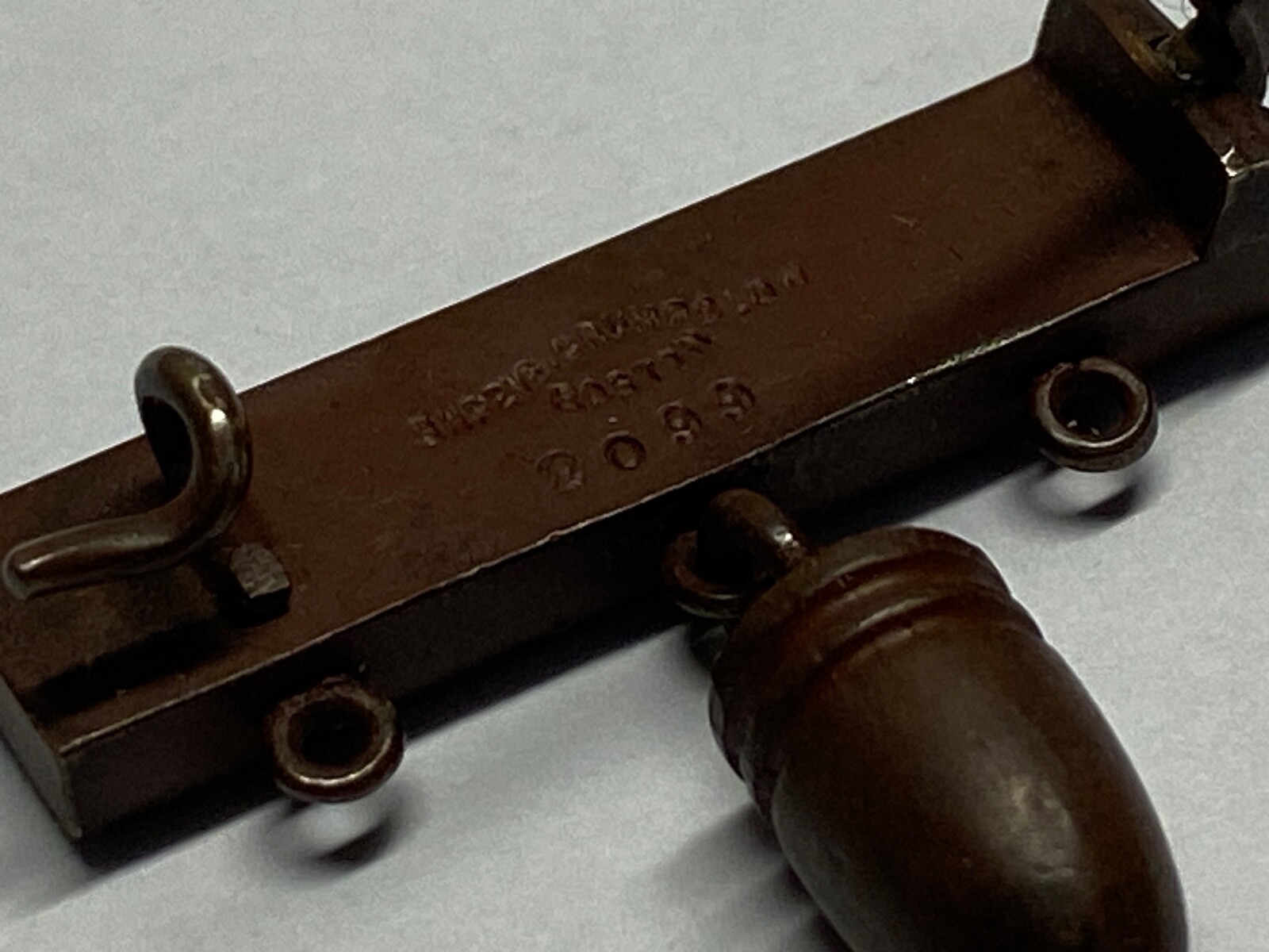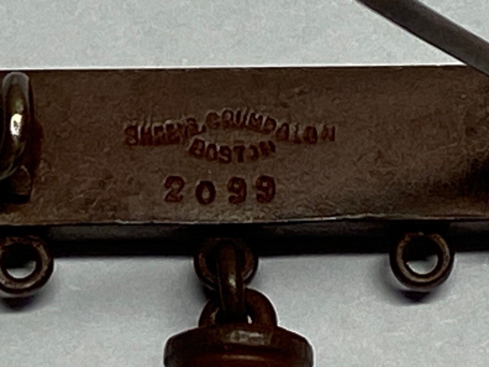 The award depicts a Bullet shaped pendant with date of qualification cast onto it. The dated Bullet shaped pendant depicts the date of the award, in this case 1890 which is the date of qualification cast onto it. The hallmark "Shreve Crump and Low" is impressed on the reverse of the top bar. The serial number ?2099 is also impressed on the reverse of the top bar. The front of the top bar reads ?MARKSMAN? superimposed over the letters ?MVM?. This is a type two award as its overall dimensions along with the font size increased slightly from the type one awards. The cabinet cards are not included and are only to show how these Marksmanship Awards were worn.