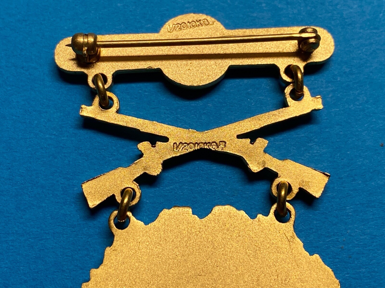 The easiest method to distinguish these clasps is by the markings or hallmarks on the reverse. Original gold-colored clasps dating from the World Wars are marked 14K on the reverse side butt or stock of the weapon. 1955 badges either are not marked (which allows for the false markings at this time) or are marked 1/20 KGF at the weapons intersection