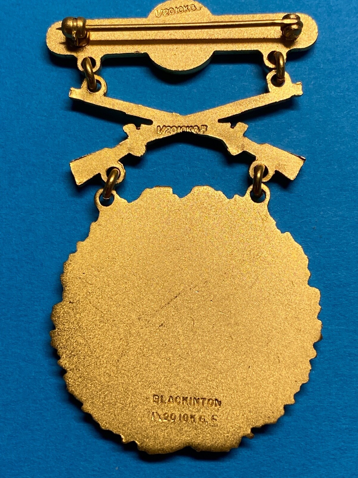 This is an original prototype made in 1958. Pinback with functional rotating clasp. The reverse is hallmarked (medal reverse) ? BLACKINTON, 1/20-10 KGF at the base of the medal; ?1/20 KGF? at the weapons intersection, and 1/20 KGF on the brooch. In some cases, the letter ?F? is hard to see. Unused, New Old Stock (NOS). Nice clean EIC badge/medal.