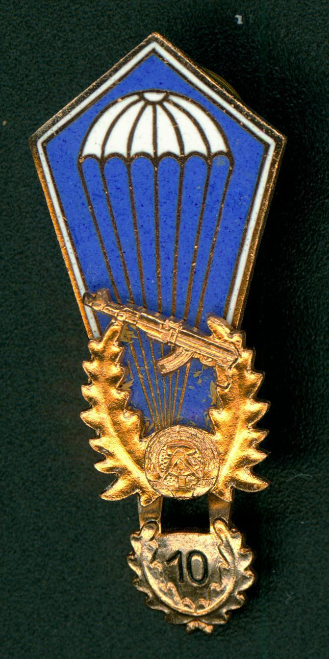 This is a vintage and original military issue Parachutist Qualification Badge from East Germany (Deutsche Demokratische Republik - DDR) with a #10 parachute jump hanger. It has a threaded screw post with dish shaped round spinner on the reverse for retention to the uniform. This Para badge is illustrated in Bragg Turner's first book, Parachute Badges and Insignia of the World, as B T# 744.