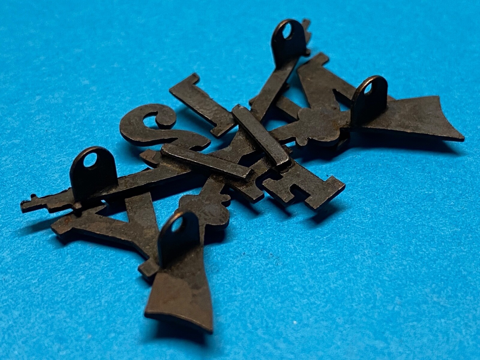 Bronze, multipiece construction. These were sewn onto the collars by using the 4 retention loops on the reverse.