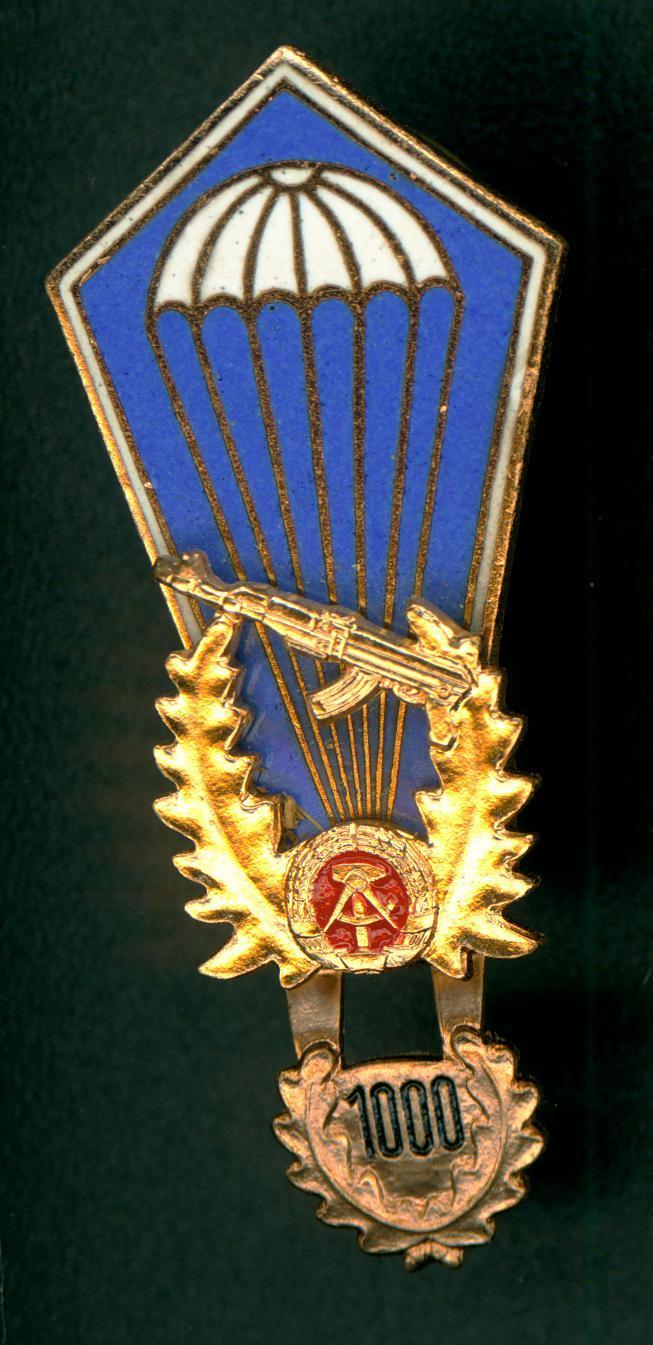 This is a vintage and original military issue Parachutist Qualification Badge from East Germany (Deutsche Demokratische Republik - DDR) with a #1000 parachute jump hanger. It has a threaded screw post with dish shaped round spinner on the reverse for retention to the uniform. This Para badge is illustrated in Bragg Turner's first book, Parachute Badges and Insignia of the World, as B T# 744.