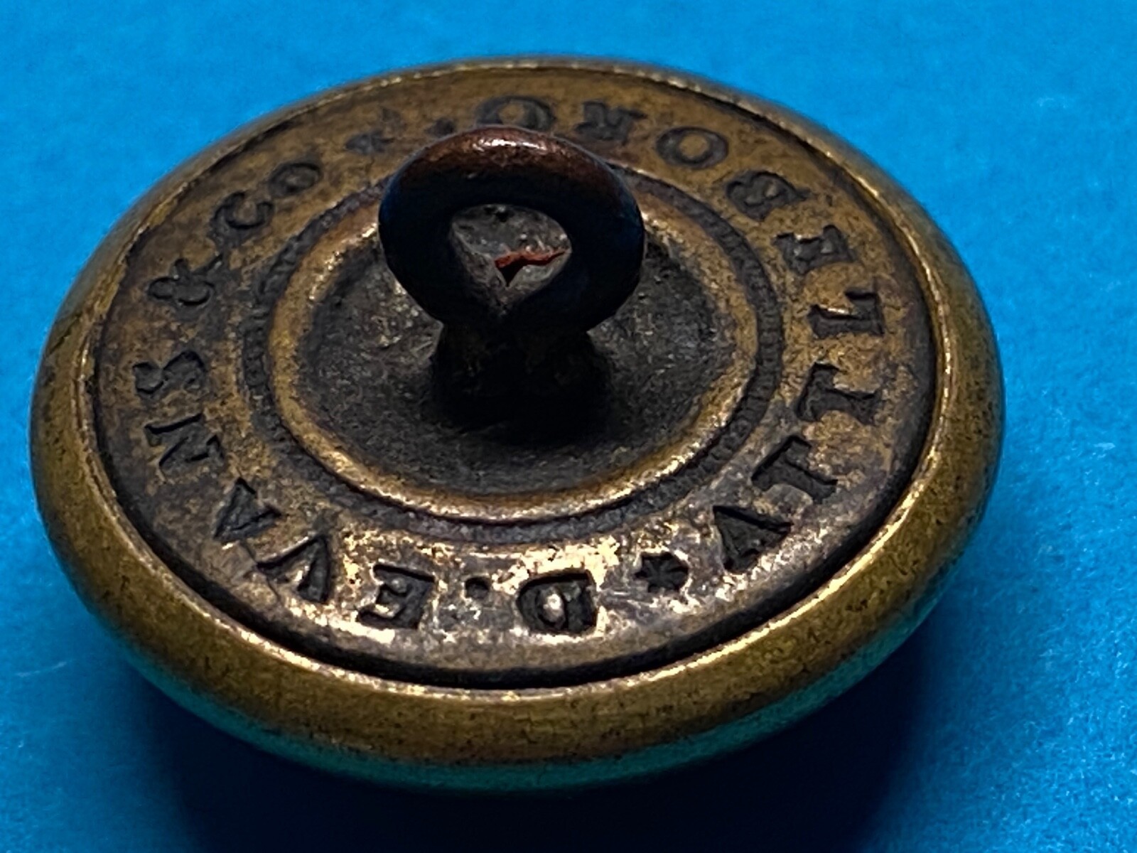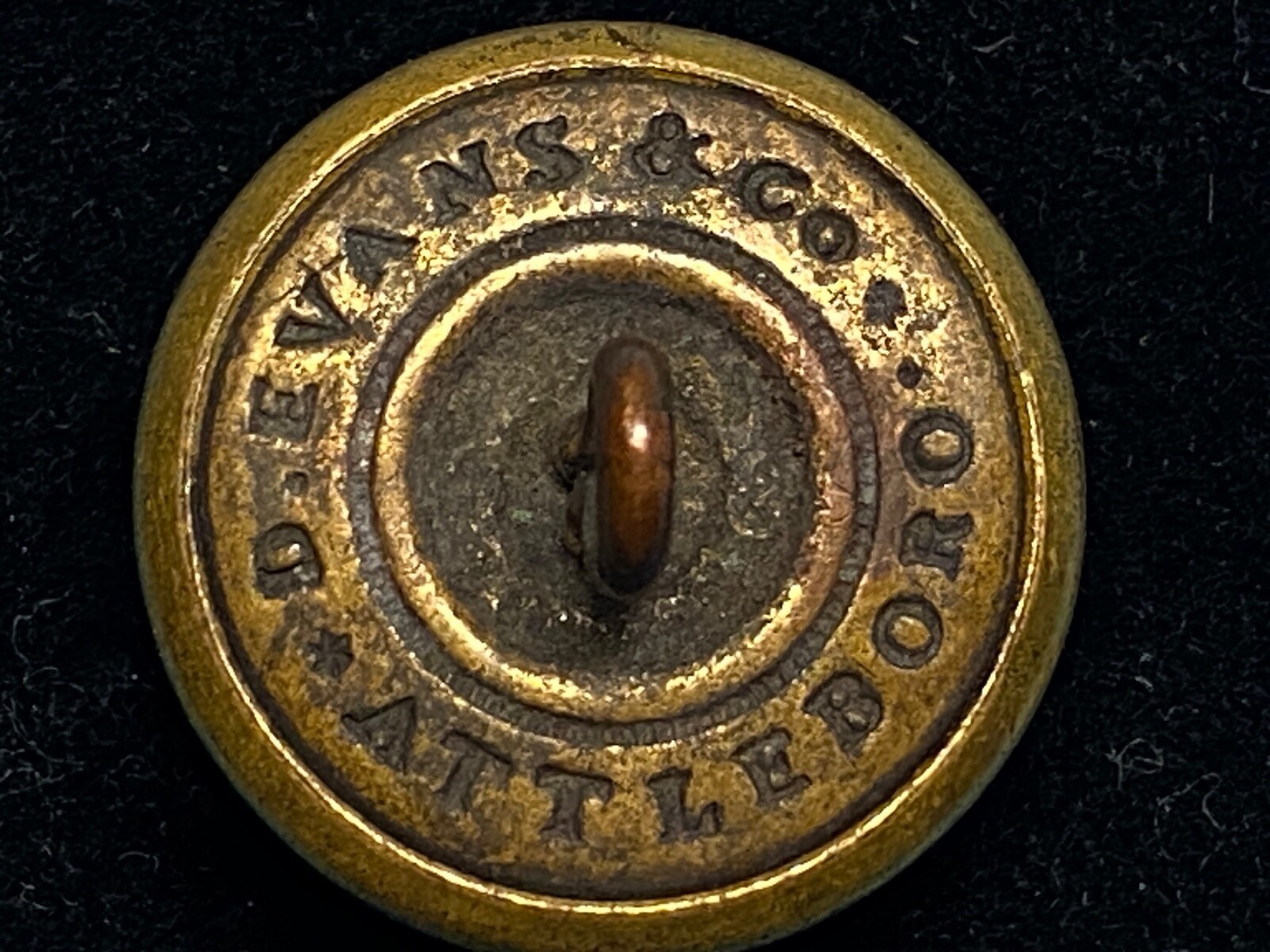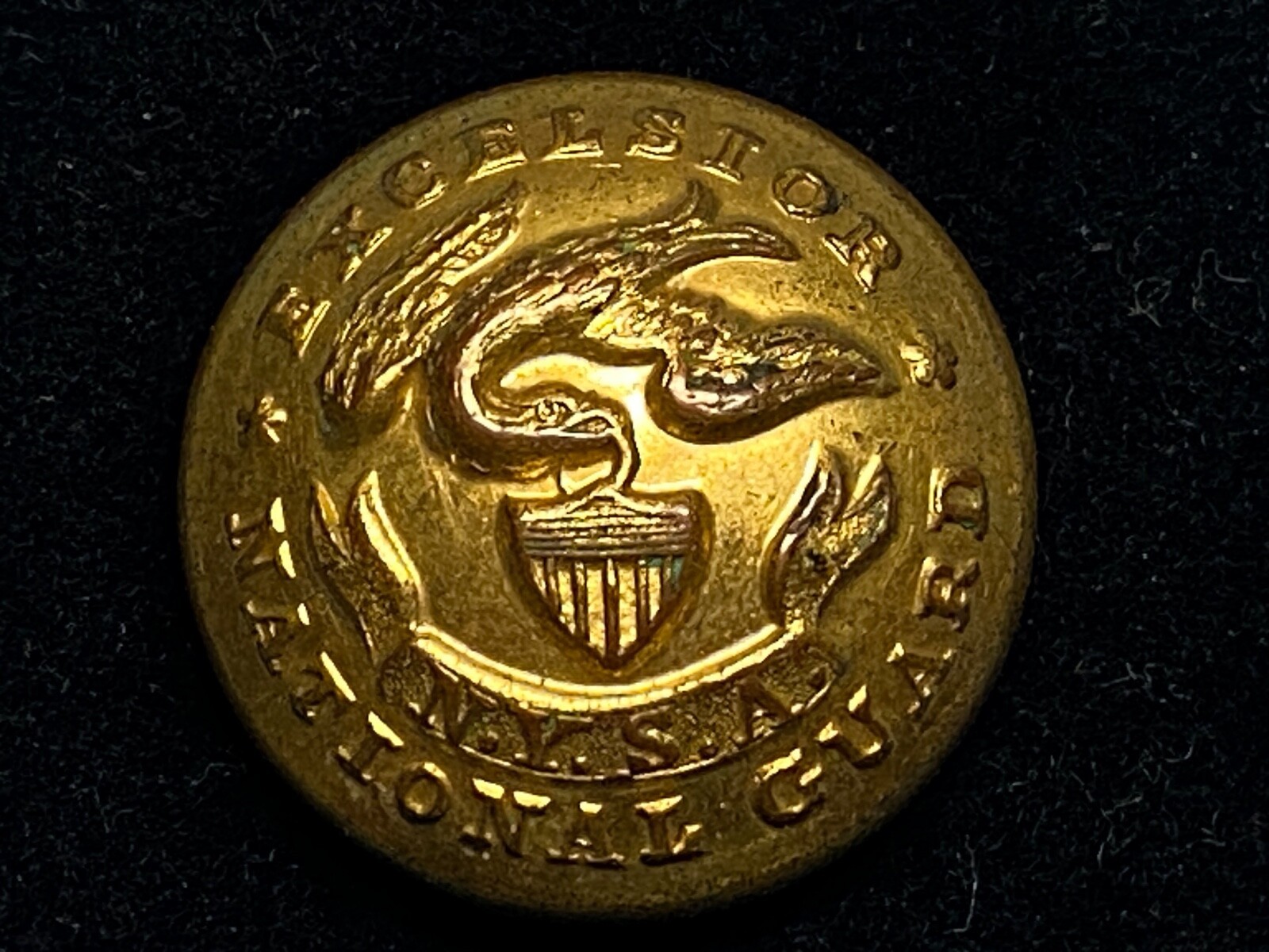 Non-excavated coat sized button of the New York, National Guard, Artillery. The back retains a standup shank and the backmark ?D. EVANS CO. ATTLEBORO? Eagle has a forked tail, 20mm