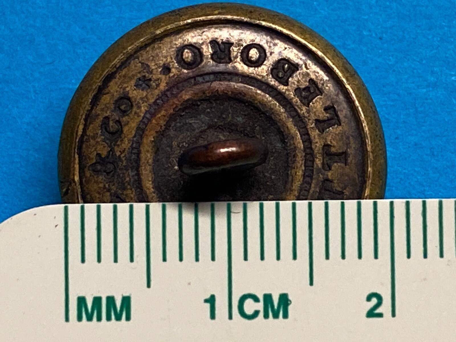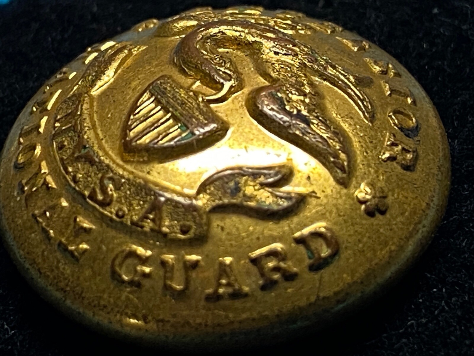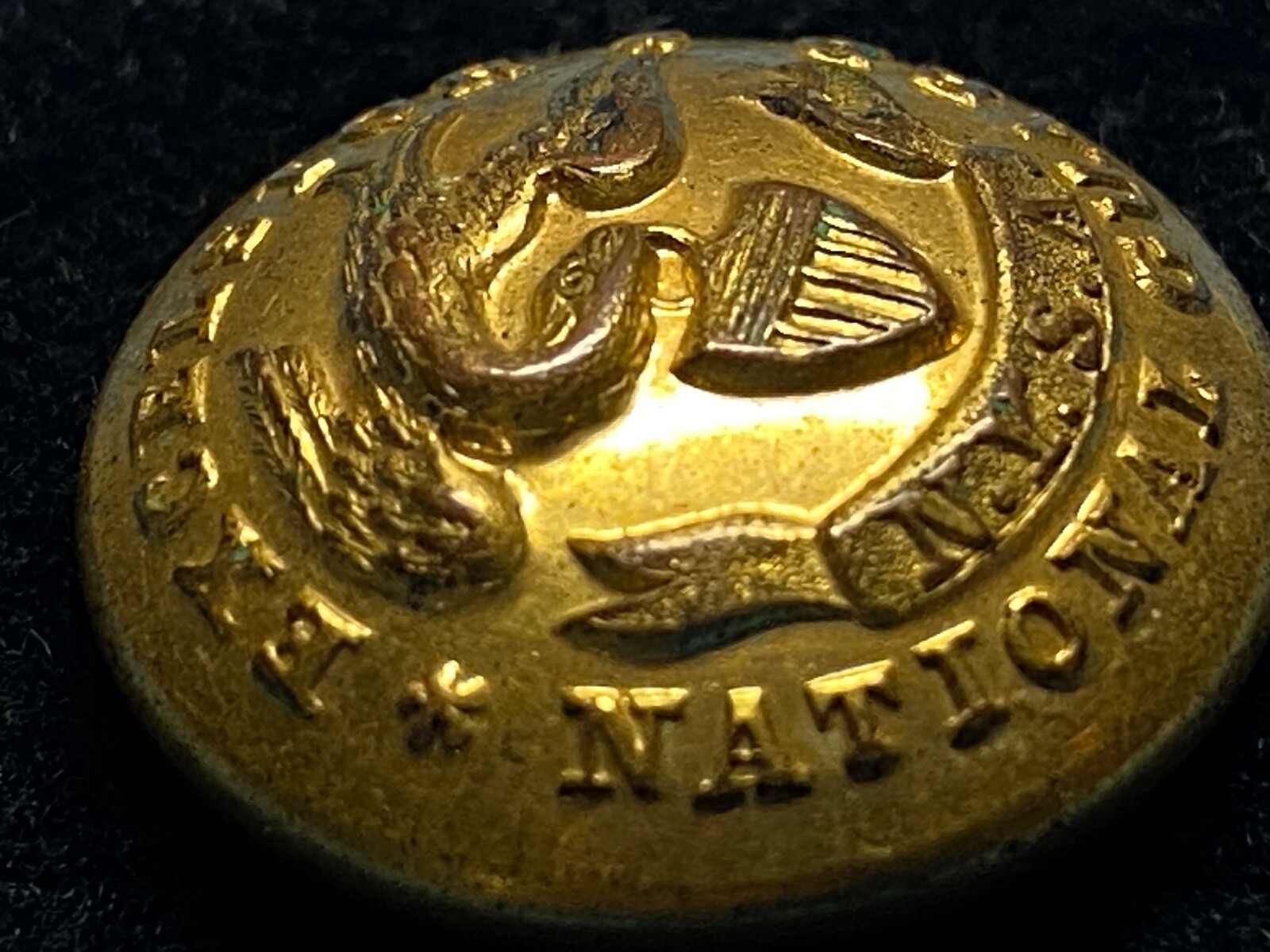 Non-excavated coat sized button of the New York, National Guard, Artillery. The back retains a standup shank and the backmark ?D. EVANS CO. ATTLEBORO? Eagle has a forked tail, 20mm