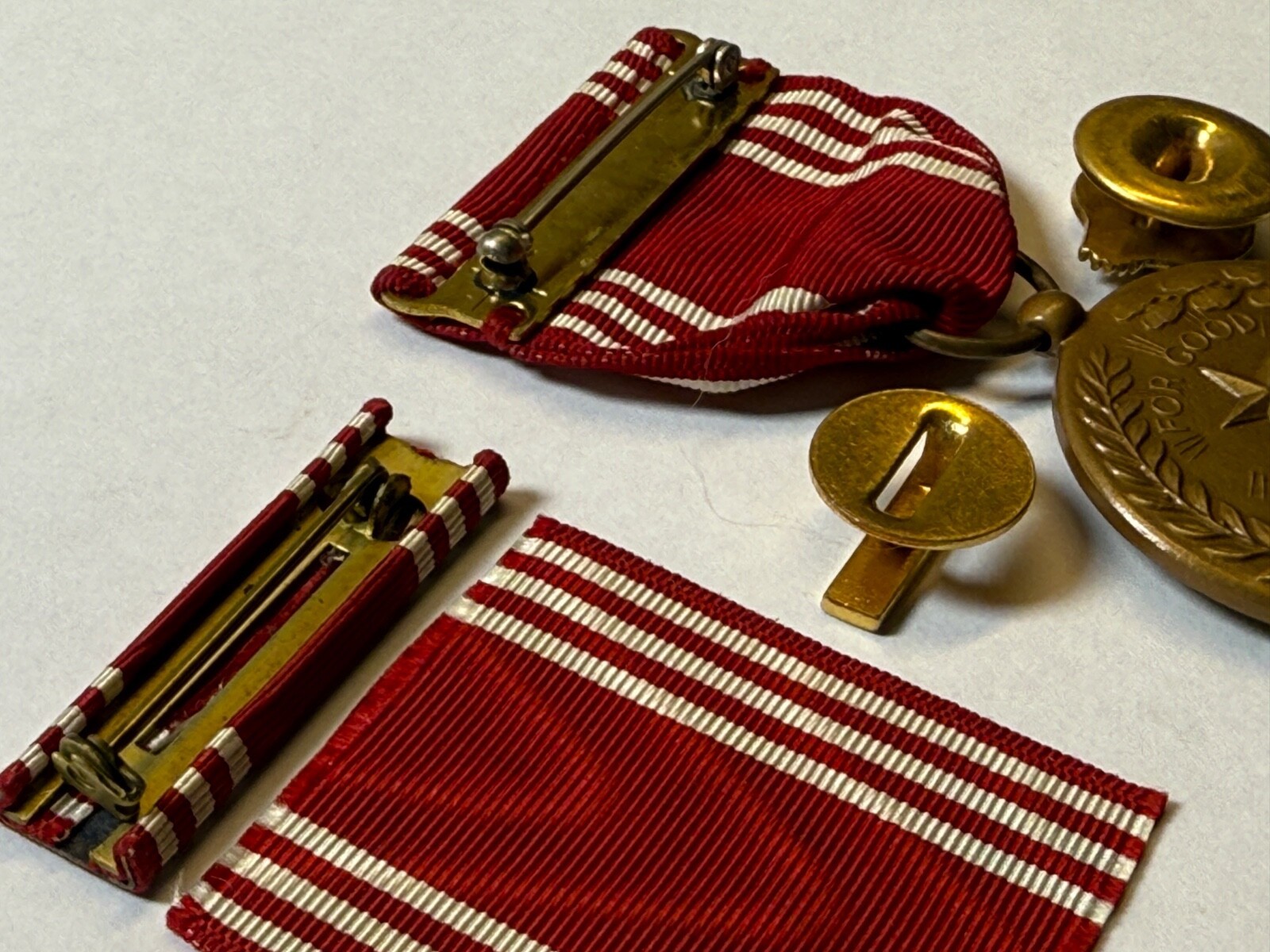 Full sized medal. Slot brooch, functional rotating clasp. Pinback Ribbon with functional rotating clasp. Discharge Lapel Badge and Ribbon Bar lapel badge. Extra ribbon swatch.