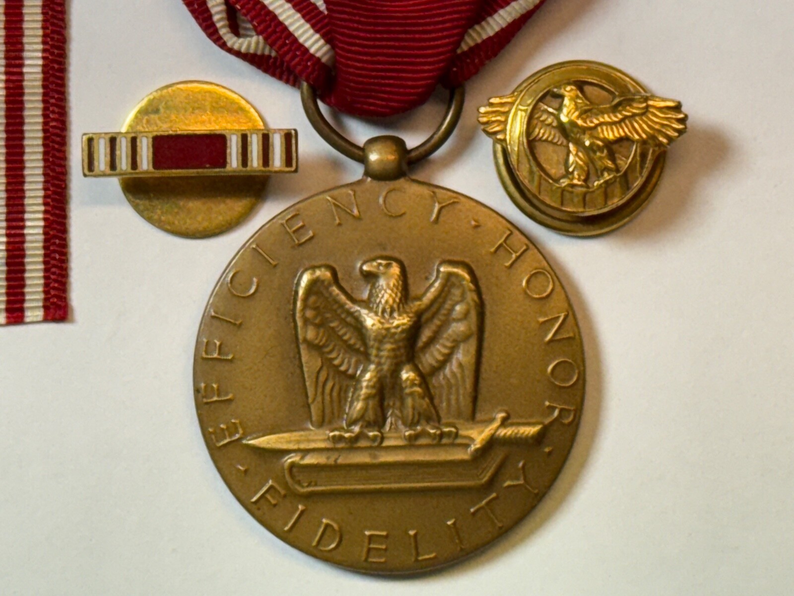 WWII, ARMY GOOD CONDUCT MEDAL, PINBACK RIBBON, DISCHARGE BADGE, LAPEL BADGE, NAMED