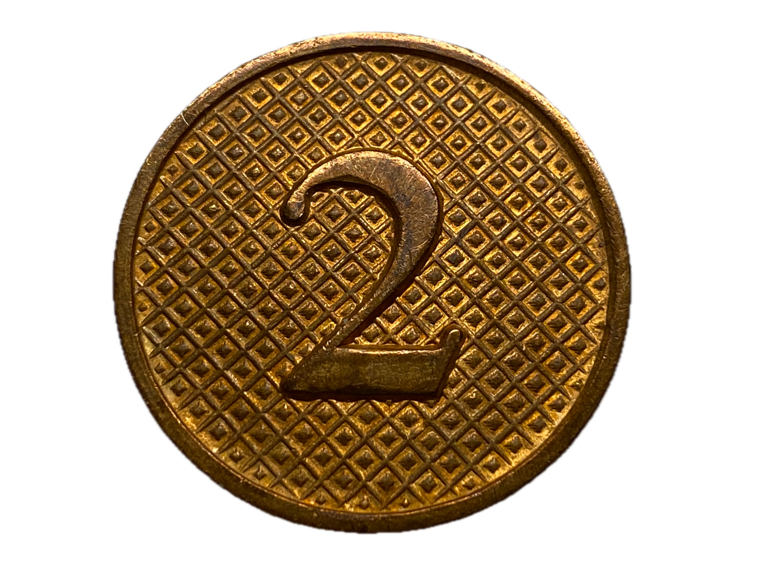 The distinction between Type I and Type II disks is minor and is one made by collectors rather than the military. Type I and Type II disks continued in use until the advent of the Type III disk and likely were issued until stocks of them were exhausted after 1937, which was the usual practice by the Army. Type II disks were also one piece screw post disks but have a more intricate background pattern than the Type I disk. The pattern consists of a series of diagonal cross hatched lines with a pattern of shields or acorns in the squares formed by the lines. This background pattern was established as the sole official one by Army Regulations AR 600-35 of December 31, 1926 but existed as a manufacturers variation prior to that time. Prior to 1926 at least six different background types were in use and Type II background appear on disks dated to 1919 according to Albert Scipio. The regulations issued on December 31, 1926 also abolished the standing collar and introduced a label, rolled collar coat. The collar disks were then worn on the upper collar of the coat's lapels. There are also a few disks with a Type II background produced that were two piece with a branch device that could be removed for cleaning similar to the Type III disks that would follow.