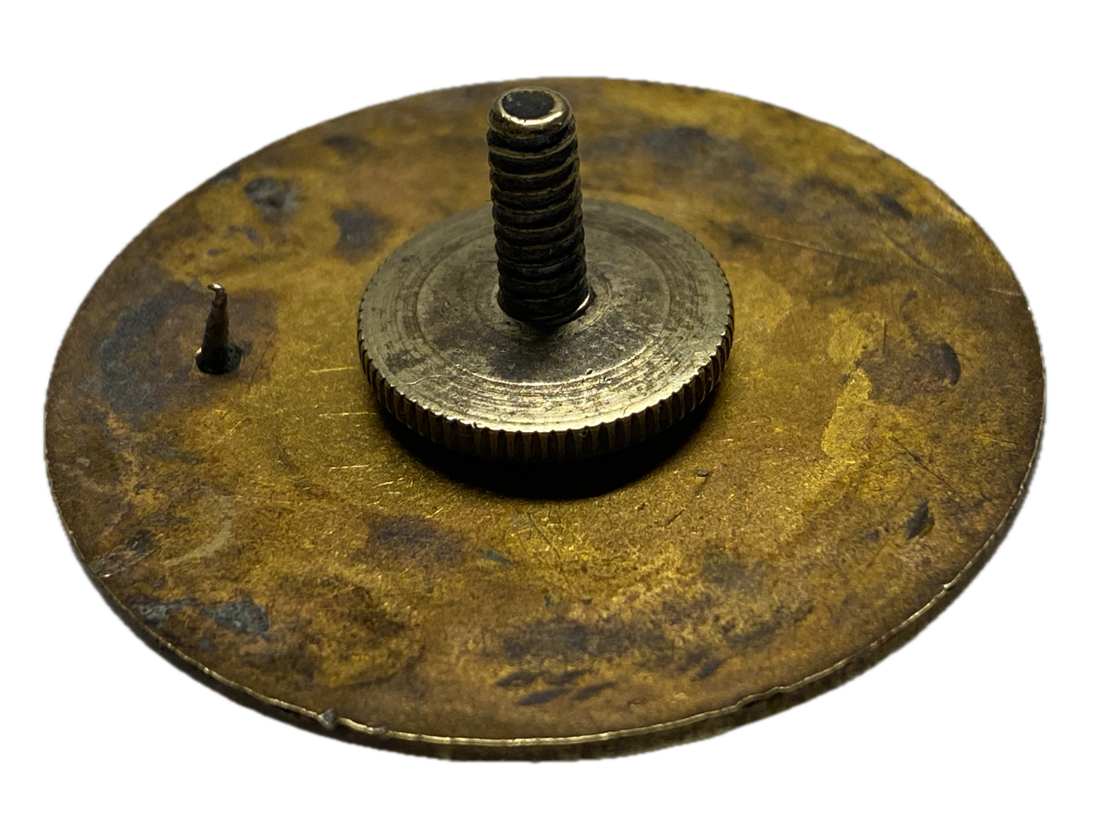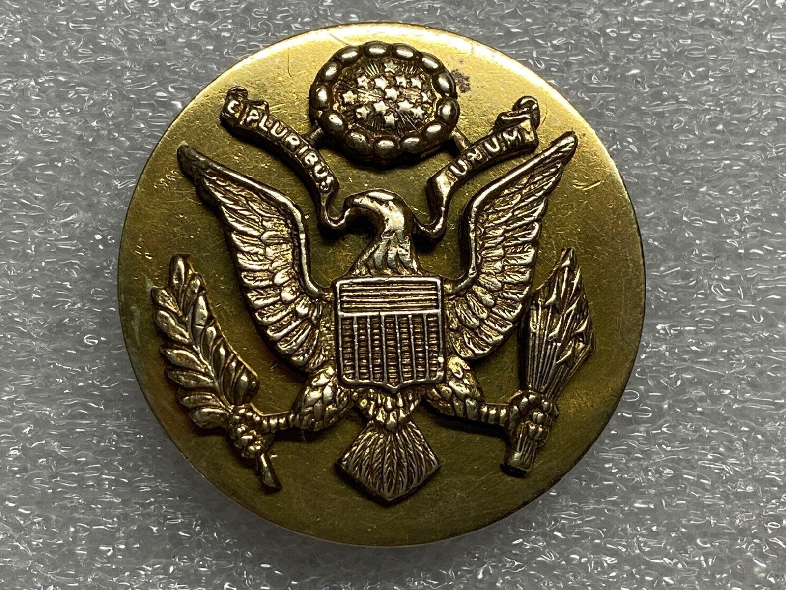 Multi-piece construction. Brass flat disk with a separate flat brass eagle, screwback. The eagle is gold plated and does not have any support bars under the ?E PLURIBUS UNUM? streamer. Diamond tail pattern.