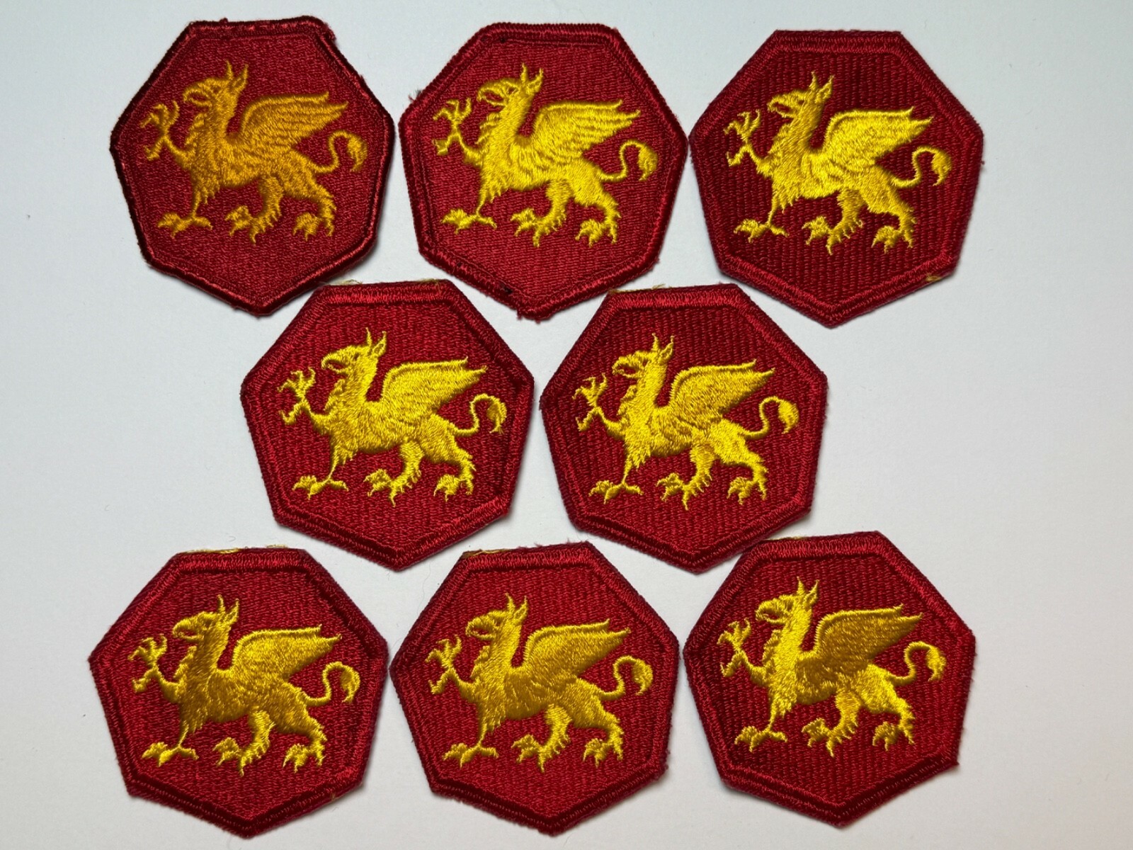 The patch features a golden griffin on a red seven-sided polygon (heptagon). The griffin, a mythical creature combining the features of an eagle and a lion, symbolizes striking power from the air and strength on the ground, reflecting the unit's initial airborne capabilities. The heptagon represents the seven states where the division was activated.