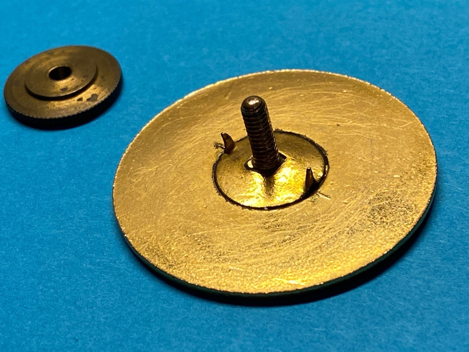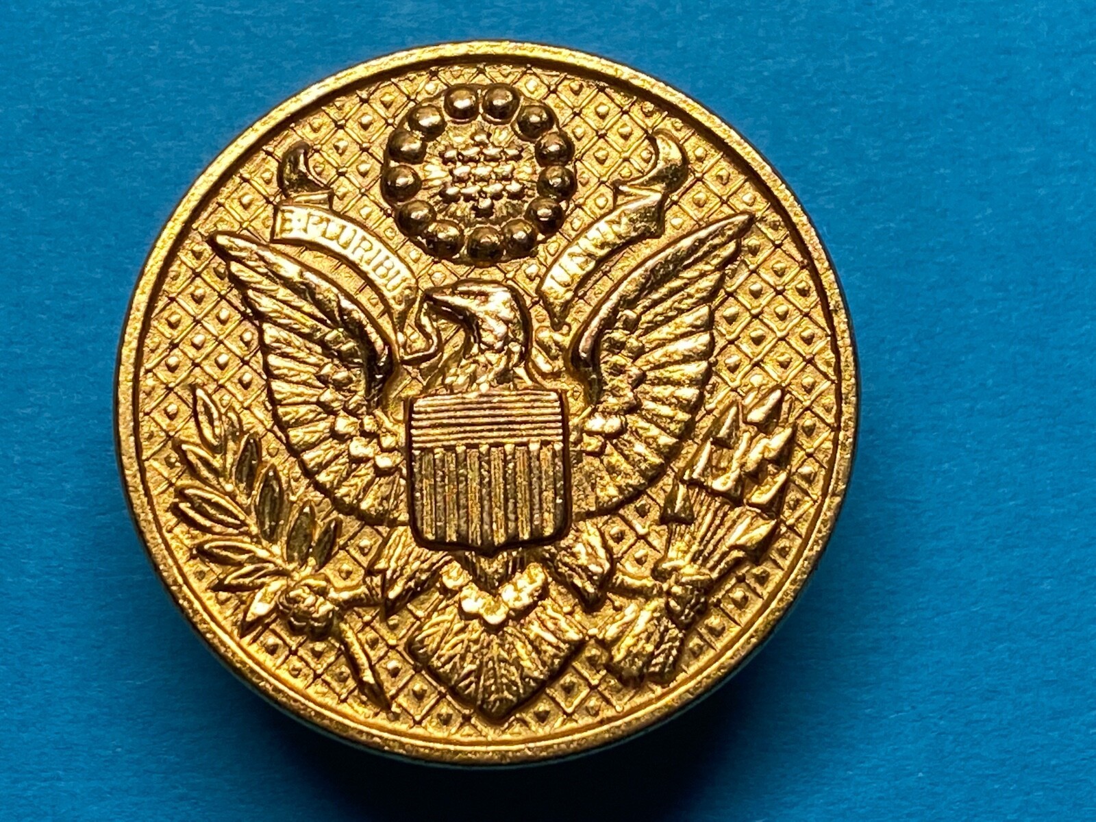 Many enlisted men?s cap ornaments between WWI and WWII had eagles and the legs of the eagles of the older frog leg style. Enlisted cap devices during this time had shields as a background to match the backgrounds of the collar disks. Nice clean cap device, brass construction, screw back with original thumb screw. Measures 1-1/2? in diameter.