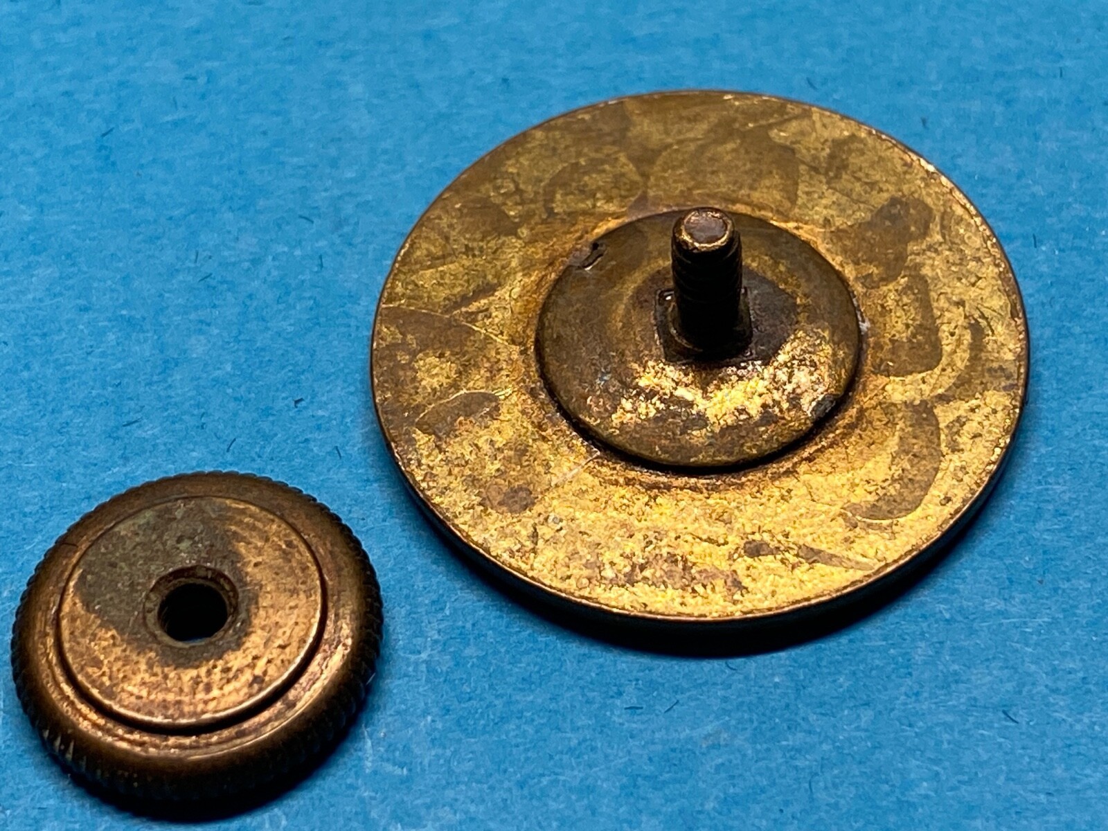 The distinction between Type I and Type II disks is minor and is one made by collectors rather than the military. Type I and Type II disks continued in use until the advent of the Type III disk and likely were issued until stocks of them were exhausted after 1937, which was the usual practice by the Army. Type II disks were also one piece screw post disks but have a more intricate background pattern than the Type I disk. The pattern consists of a series of diagonal cross hatched lines with a pattern of shields or acorns in the squares formed by the lines. This background pattern was established as the sole official one by Army Regulations AR 600-35 of December 31, 1926 but existed as a manufacturers variation prior to that time. Prior to 1926 at least six different background types were in use and Type II background appear on disks dated to 1919 according to Albert Scipio. The regulations issued on December 31, 1926 also abolished the standing collar and introduced a label, rolled collar coat. The collar disks were then worn on the upper collar of the coat's lapels. There are also a few disks with a Type II background produced that were two piece with a branch device that could be removed for cleaning similar to the Type III disks that would follow.
