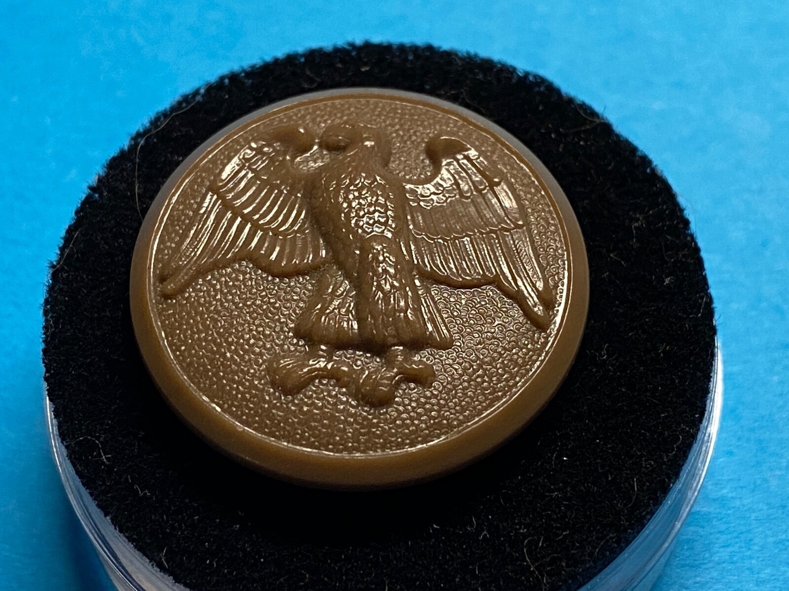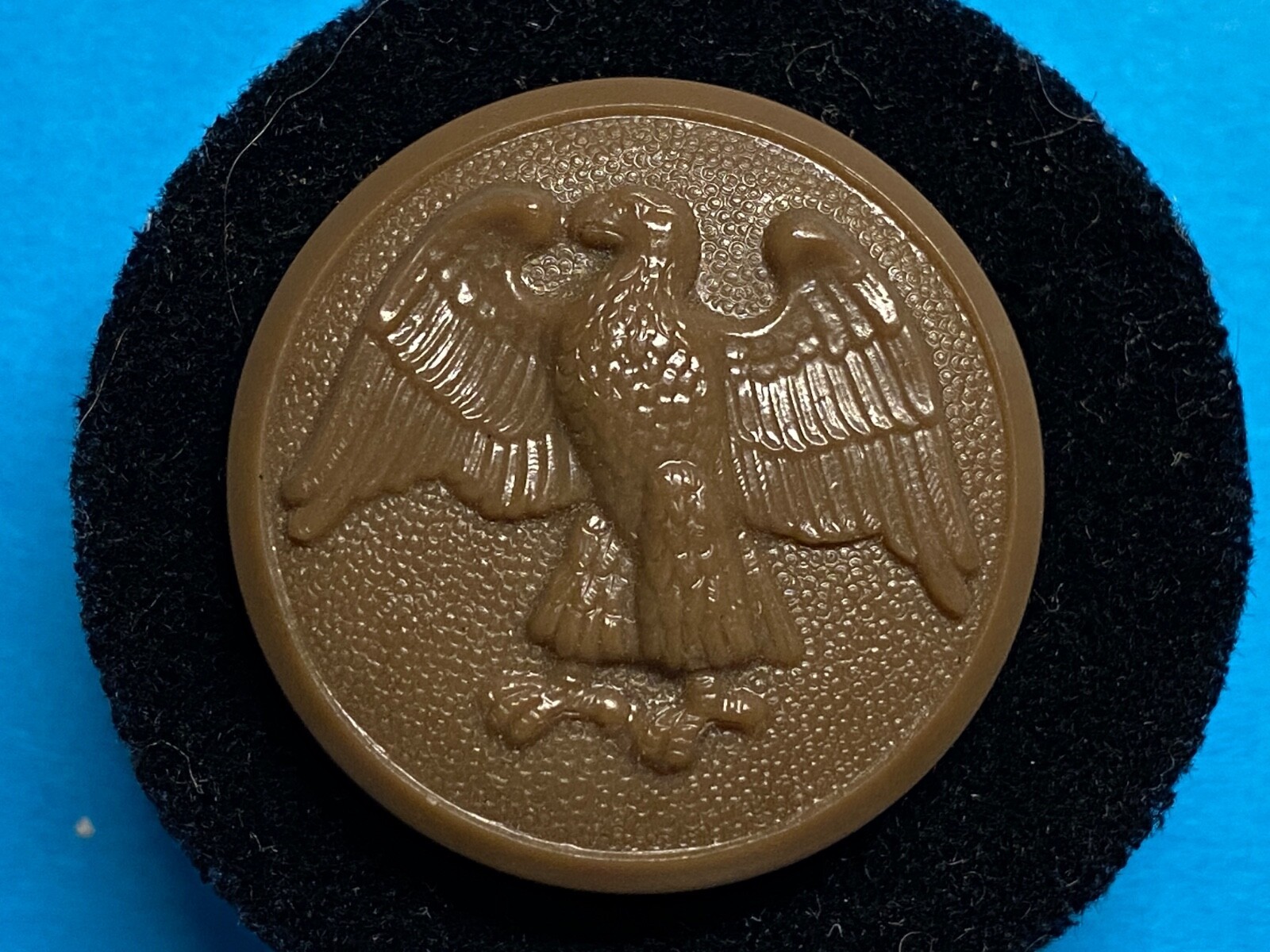 During WWII, there was a shortage of metal. Due to the shortage, some insignia and buttons were made of Bakelite or a plastic material. 28mm. Button displays an spread winged eagle, on a stippled field. Steel shank is intact.