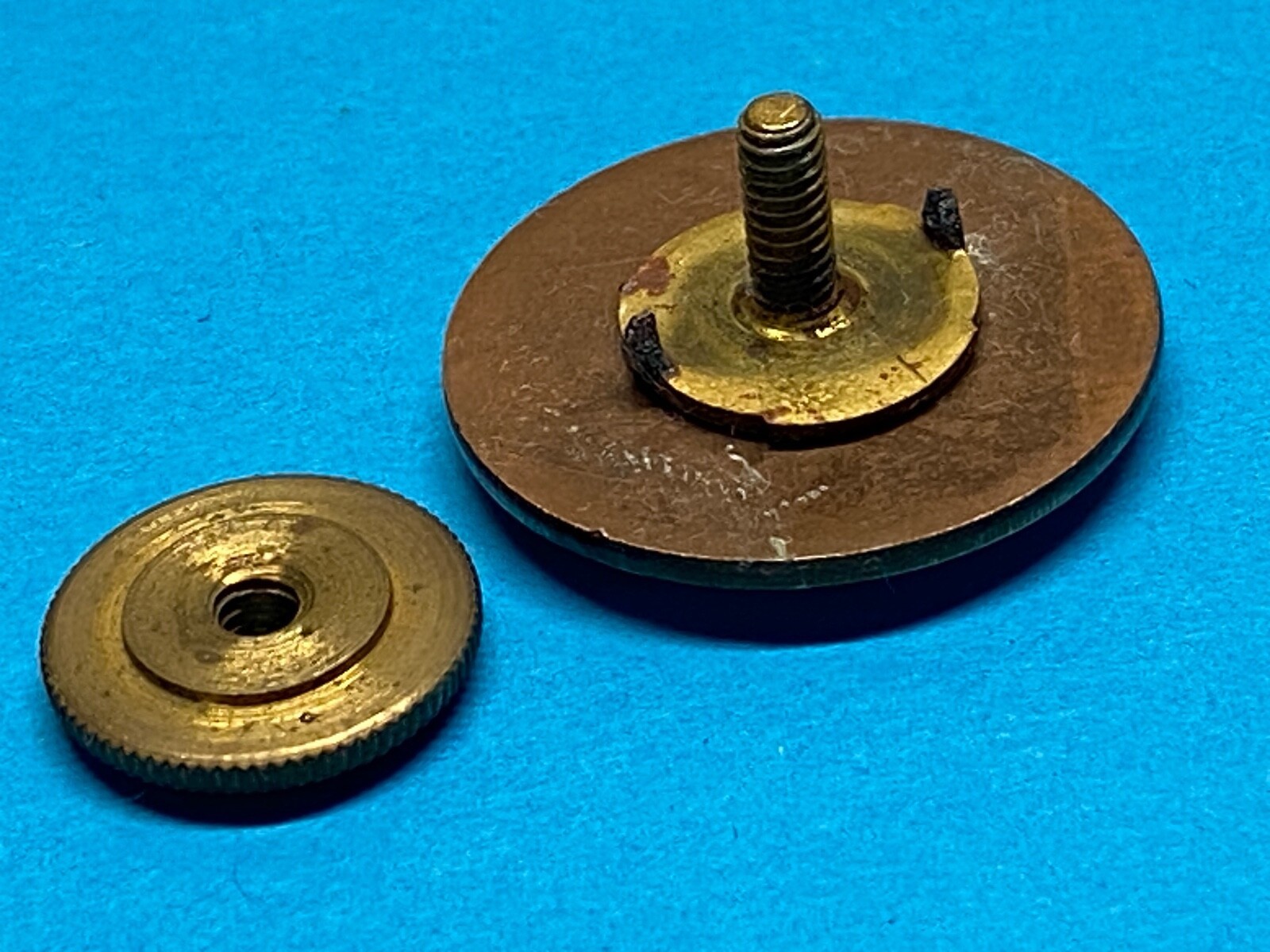 In 1937 the Army adopted a new type of disk that differed from the Type I and II in that the disk was two-piece. It had a plain blight brass finish with a small square hole in the center. The device of the service branch or the letters U.S. were a separate piece that had the screw post in its back and fit into the hole in the disk. A separate piece screwed on the back held the disk and branch device together and the entire assembly was attached to the uniform with a screw nut. Type III disks were mass produced in the early years of World War Two and are common on period uniforms. Their production was discontinued during the war because they used a fair amount of brass, which was a strategic material. William K. Emerson called type of Type III disk adopted in 1937 a Type IIIa to distinguish it from the more recent two-piece disk that I call a "Neo-Type III" and he calls a Type IIIc.