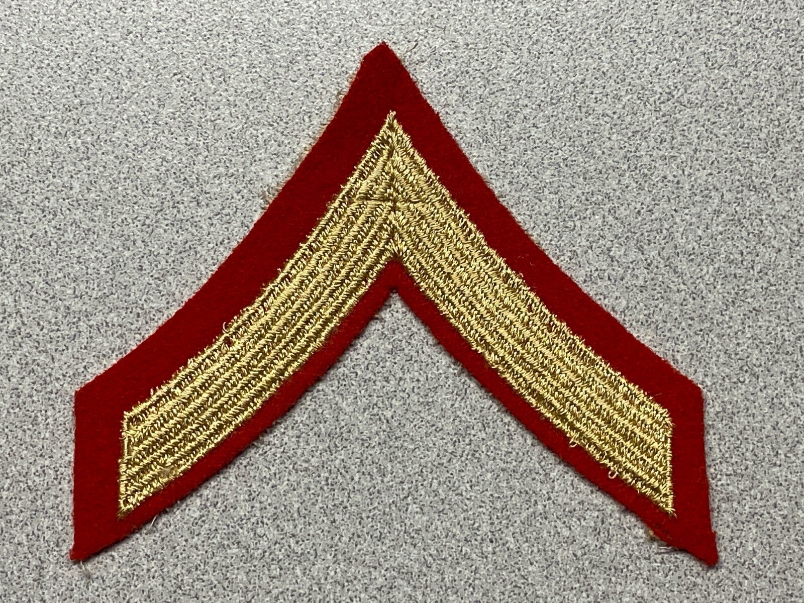 CIRCA 1959-1992, USMC PRIVATE FIRST CLASS, CHEVRON, GOLD ON RED FELT, VINTAGE