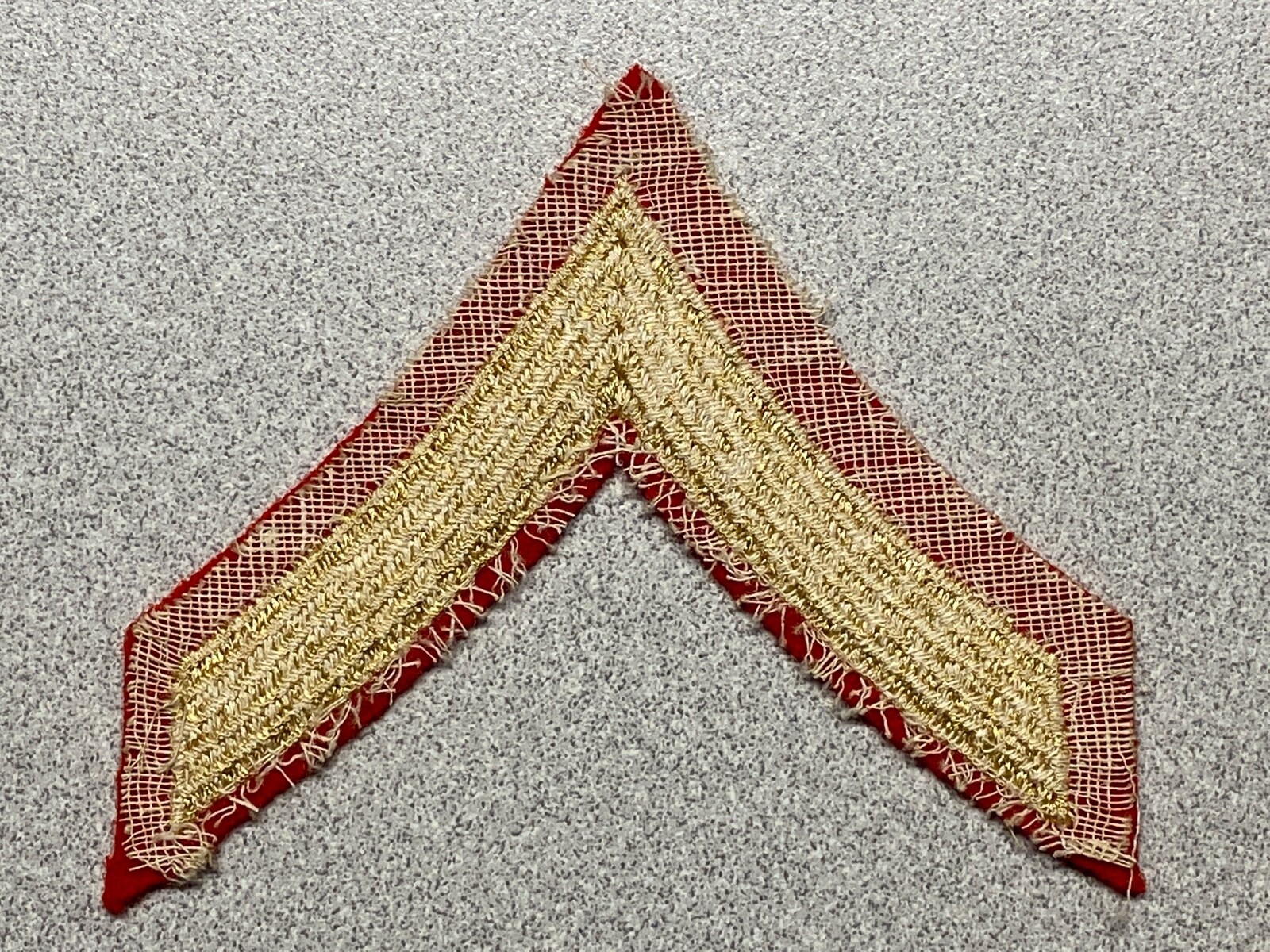 Gold chevron embroidered on red felt, cheese cloth backing.