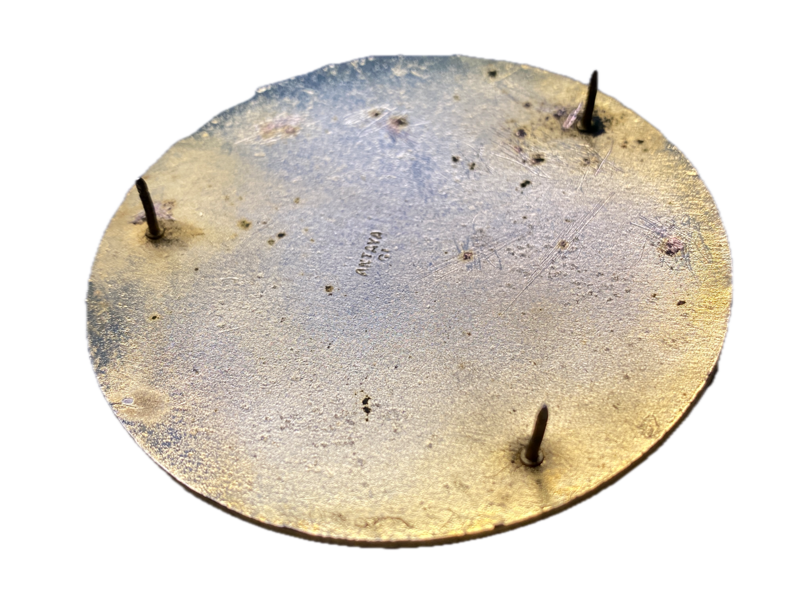 Enameled, clutch back posts, measures approximately 2-1/2" in diameter. Hallmarked "ANTAYA GI"