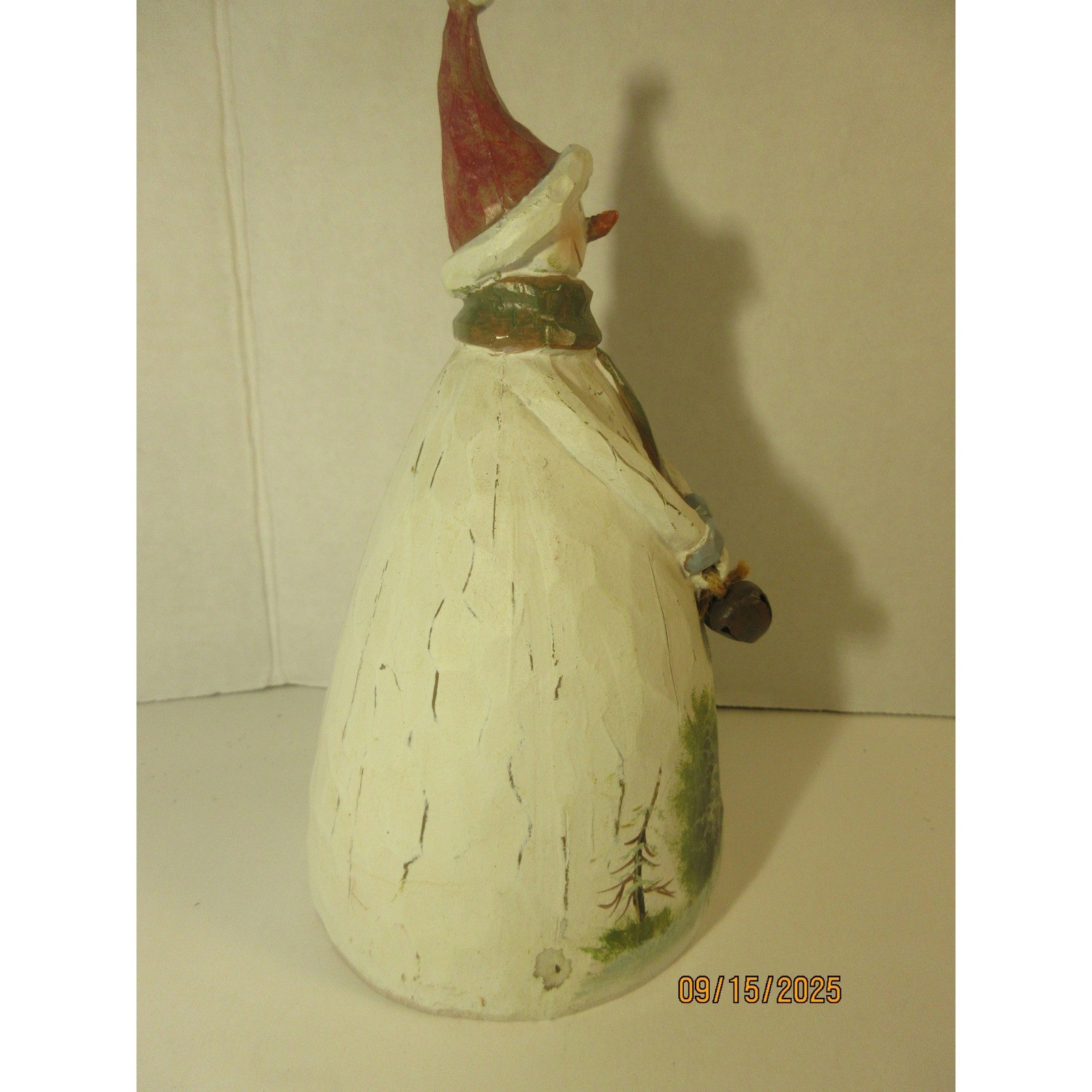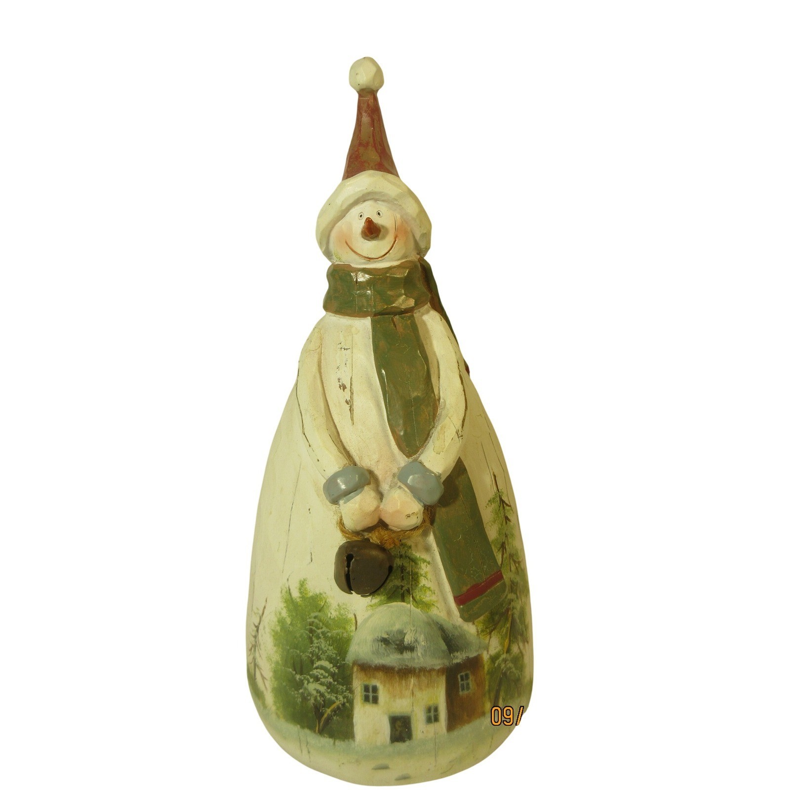 A charming rustic snowman statue conjures the magic of a snowy winter scene. Standing tall with a whimsical hat and scarf, this delightful figure holds gilded jingle bells, bringing the spirit of the holidays to life. Hand-painted details of a cozy winter cottage and frosted evergreens grace the base, creating a captivating vignette. This artfully crafted snowman is perfect for adorning your mantelpiece during the Christmas season, adding a touch of festive charm to your entryway console, or enhancing a holiday-themed tabletop display.