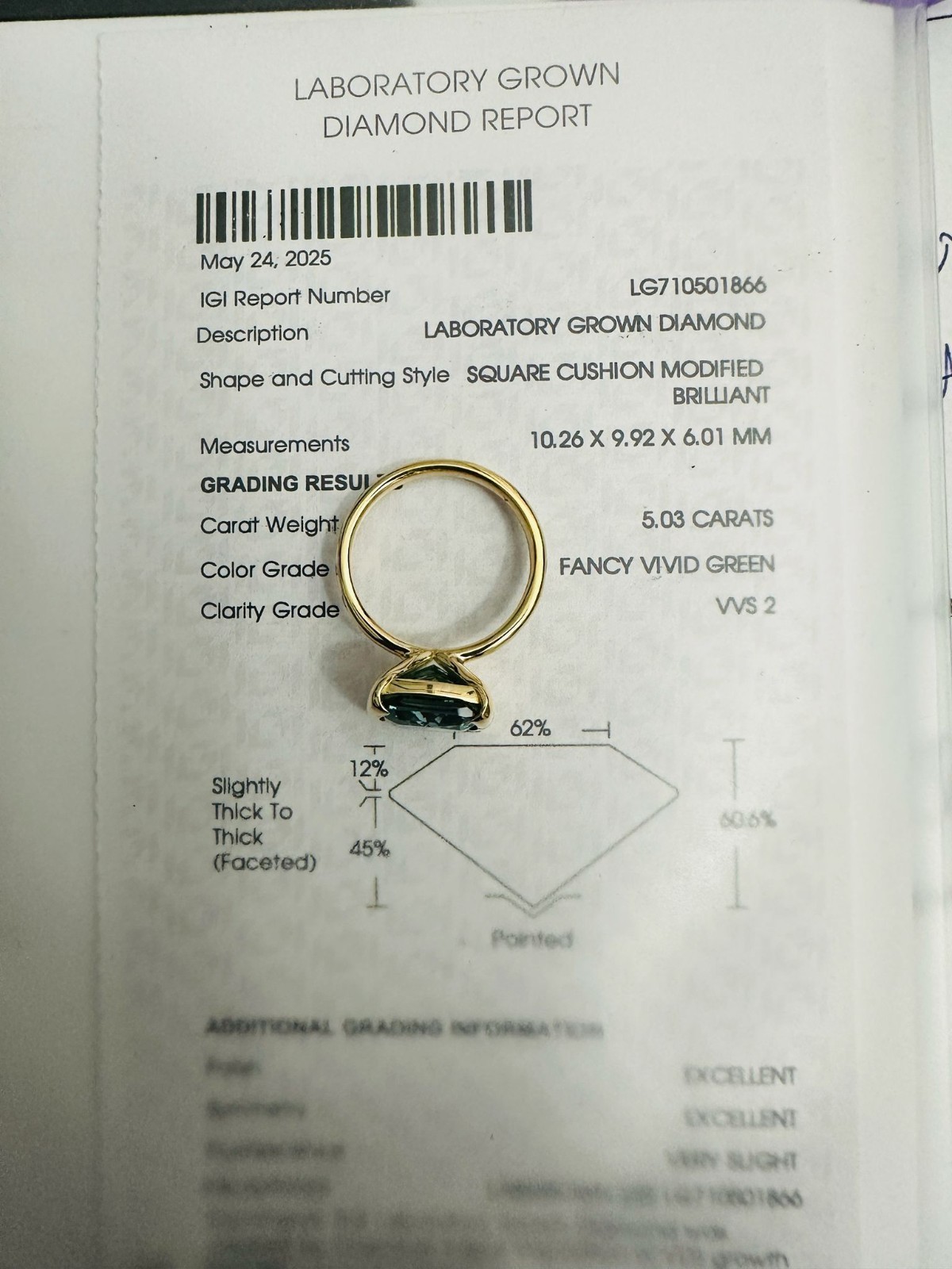 Lab Grown 5.00 Ct Fancy Green Cushion Cut Diamond IGI Certified Engagement Ring