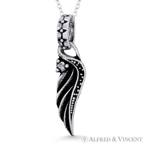The featured pendant is cast in oxidized .925 sterling silver and showcases an angel's wing design w/ an antique-finish look. The wing charm is then finished with a sturdy bail that can accommodate most standard to thicker width chains.