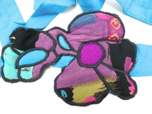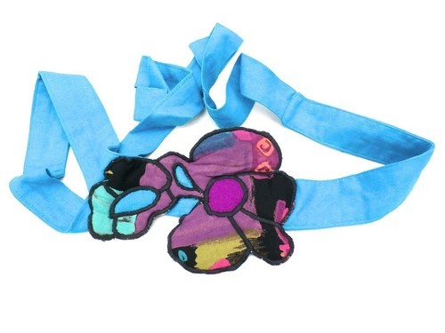 Great designer Marijke Benedict for Stijfselkissie created this pink, purple, and teal silk belt; cotton trapunto one of a kind fabric "buckle" with a 5? x 7? centerpiece and tie closure. It would really add pizazz to a plain dress or top.