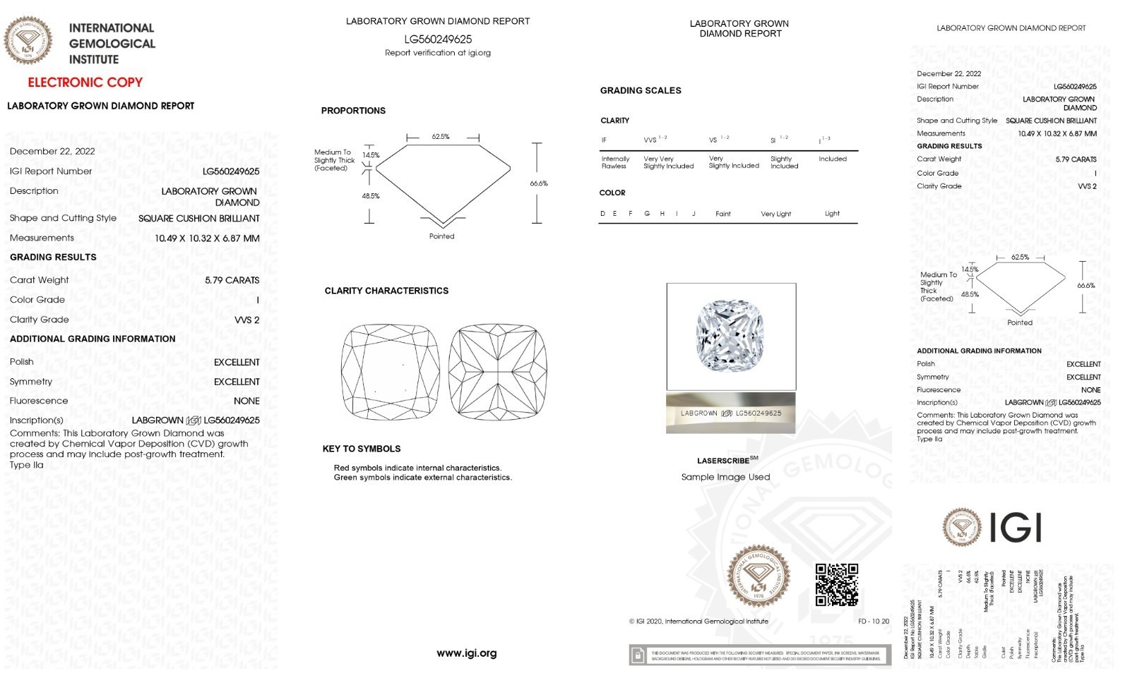 5.79 CTS CUSHION Cut IGI Certified Lab Grown CVD Diamond I Color VVS2 Clarity