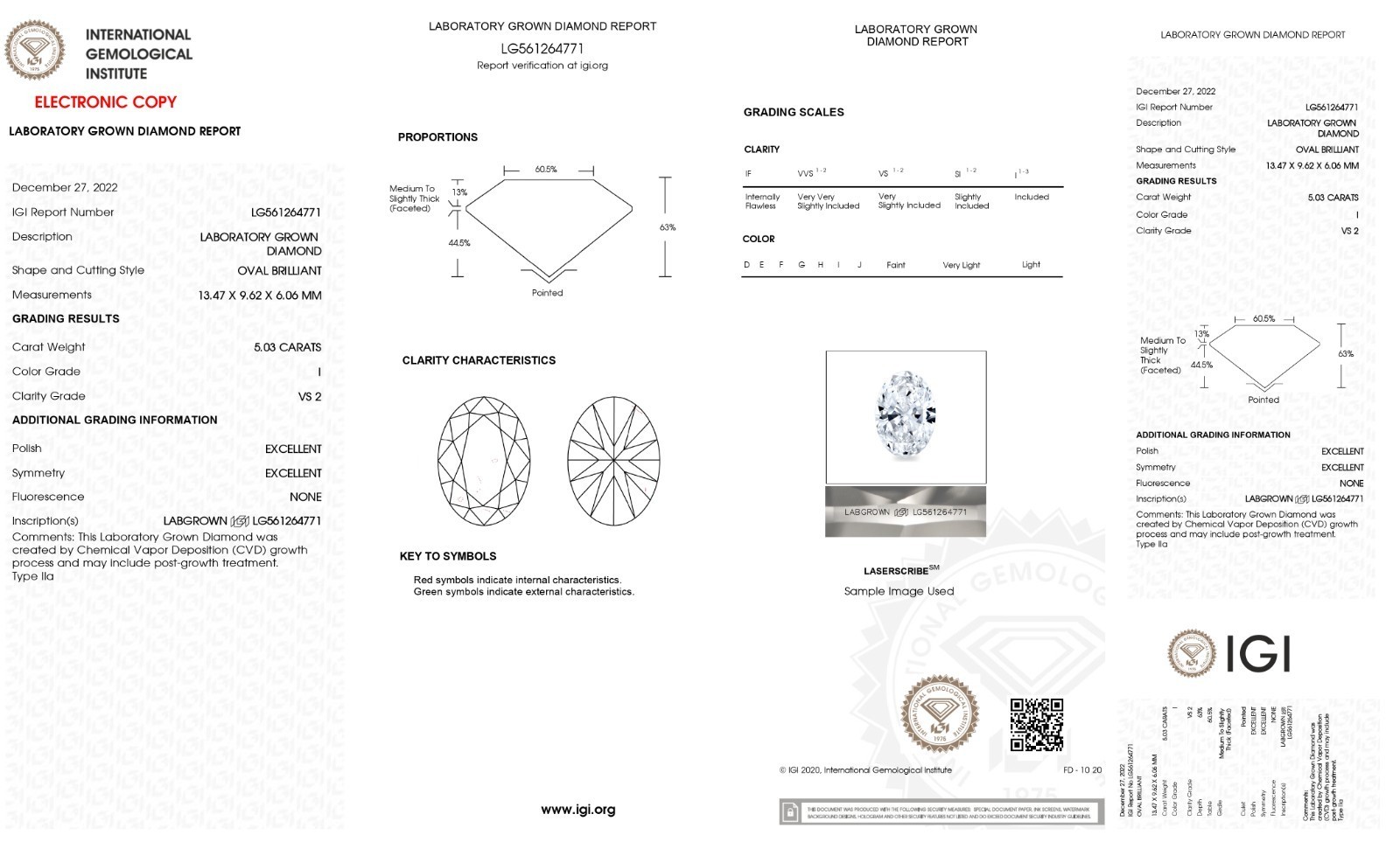 LAB GROWN 5.03 Cts OVAL Cut I Color VS2 Clarity IGI Certified CVD Diamond