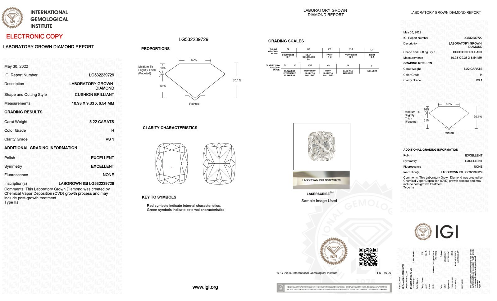 5.22 Ct CUSHION Cut IGI Certified Lab Grown CVD Diamond H Color VS1 Clarity