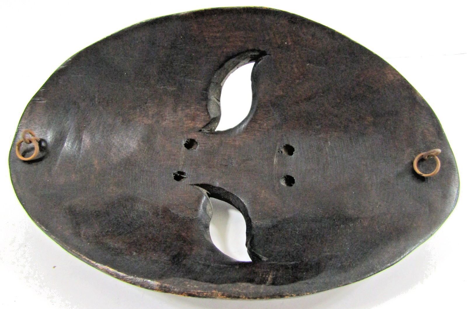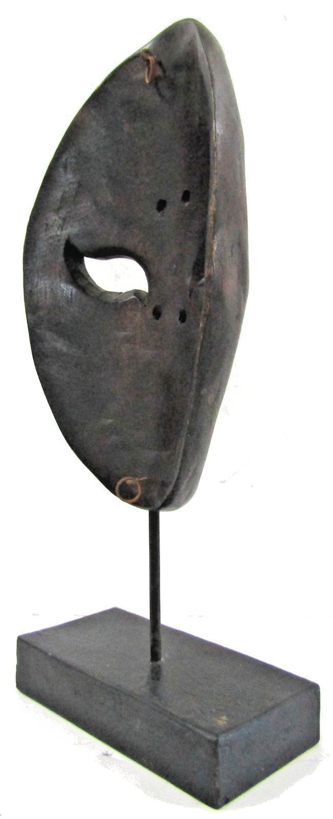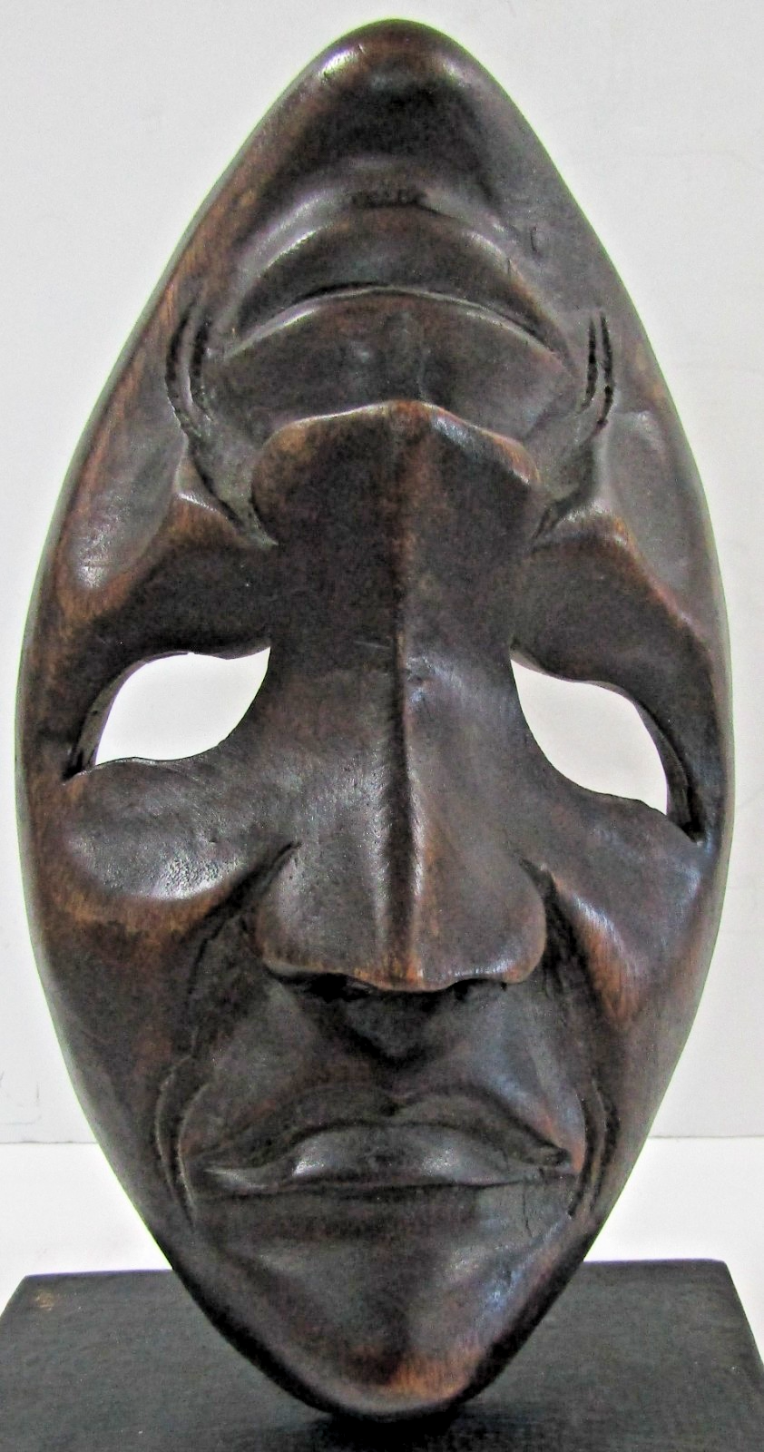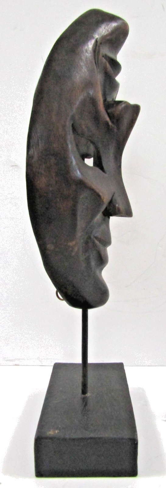 This vintage carved black wooden comedy/tragedy mask wall or stand sculpture is a unique and handmade piece of folk art. The medium-sized sculpture features intricate carving details on a wooden base, making it a striking addition to any art collection. With its contemporary design and original production technique, this mask sculpture captures the essence of masks and their symbolic themes in a beautifully crafted form. Perfect for those who appreciate traditional artistry and artisanal pieces.