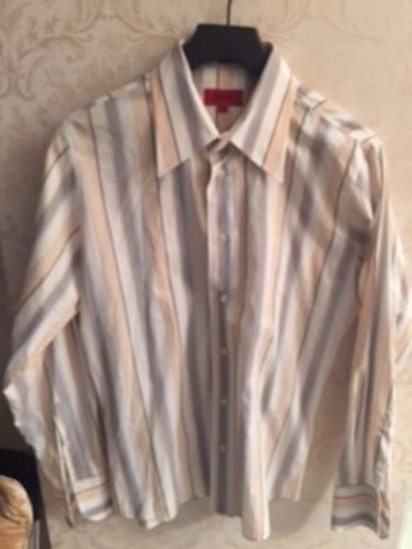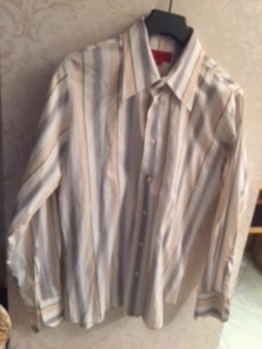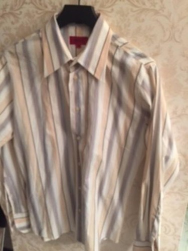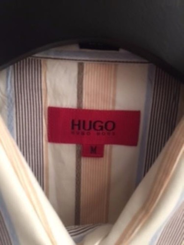 This Hugo by HUGO BOSS button down shirt is in very good pre-owned condition with no signs of damage of any kind aside from a pin hole in the right side of the collar (this is virtually imperceptible). This shirt features:
