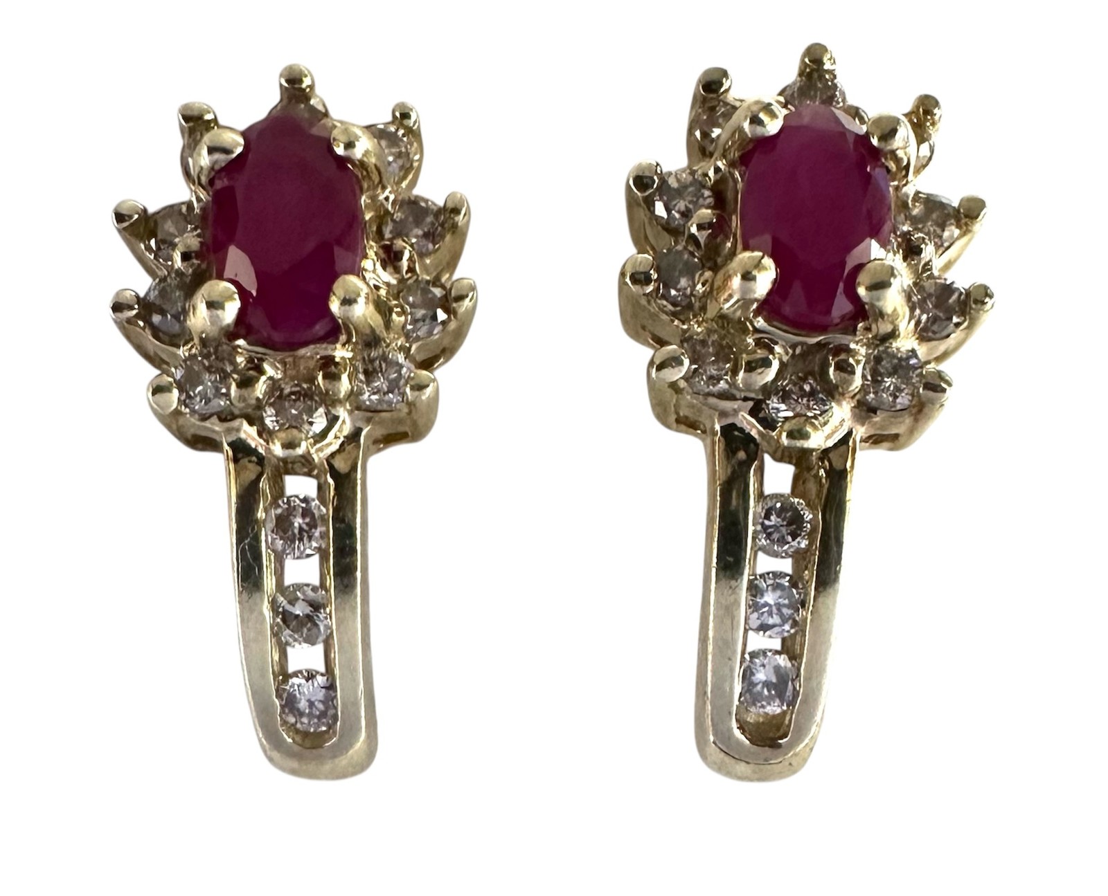 Type: EarringsWeight: 1.4Karat: 10ktMetal: Yellow GoldGender: Women'sStyle: ClusterSize / Length: 05"Owner applied: 10K 95Stone 1 quantity: 2Stone 1 shape: OvalStone 1 color: PurpleStone 1 weight (total): .50Stone 2 Quantity: 26Stone 2 Shape: RoundStone 2 Color: ClearStone 2 Weight (Total): .52Stone 2 Type: DiamondCondition:UsedNotes:Missing backs.