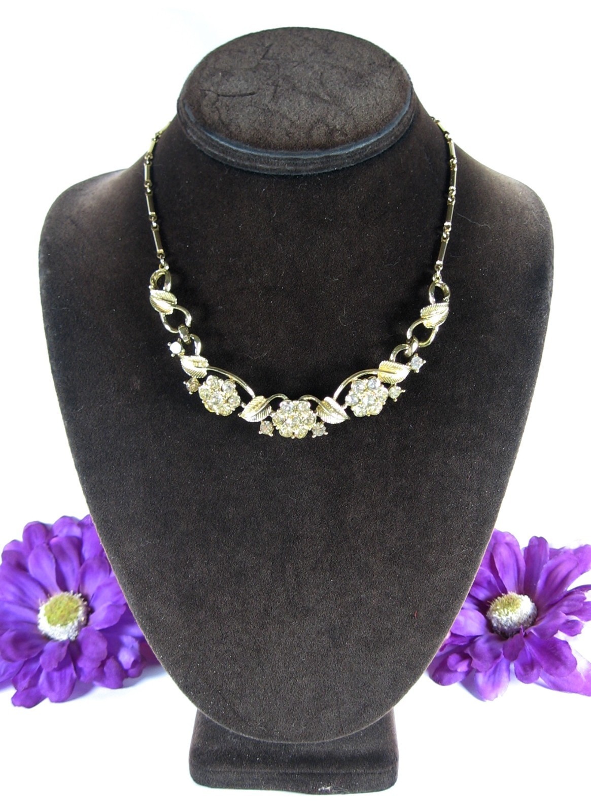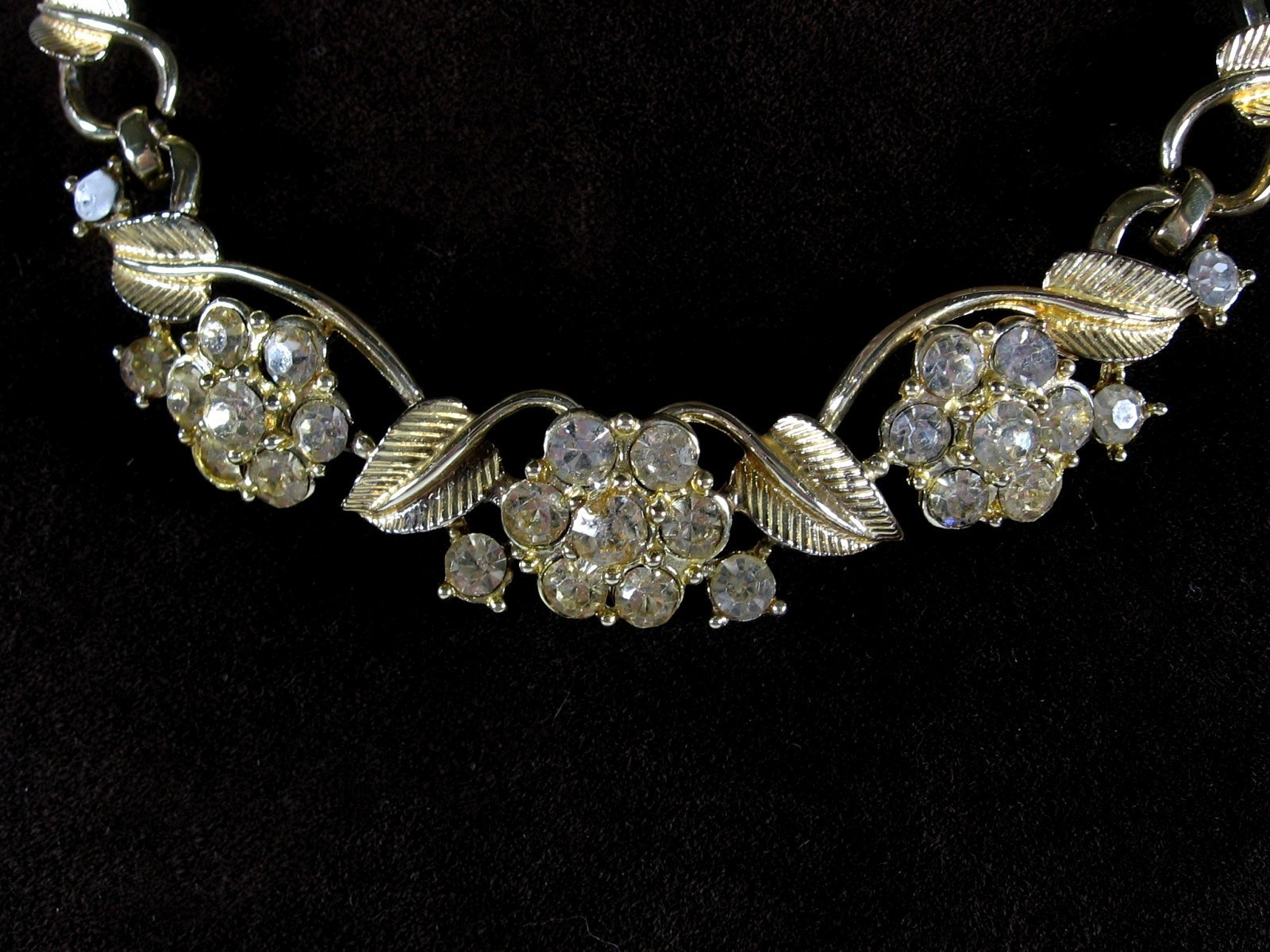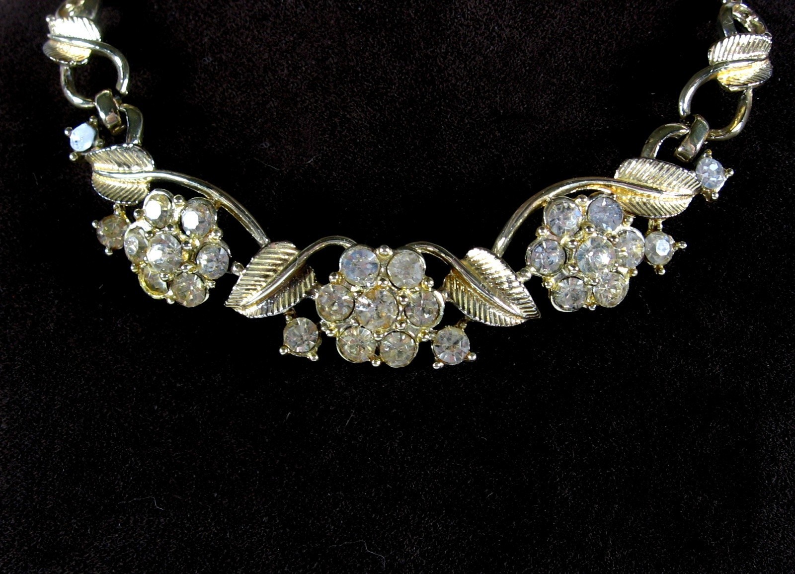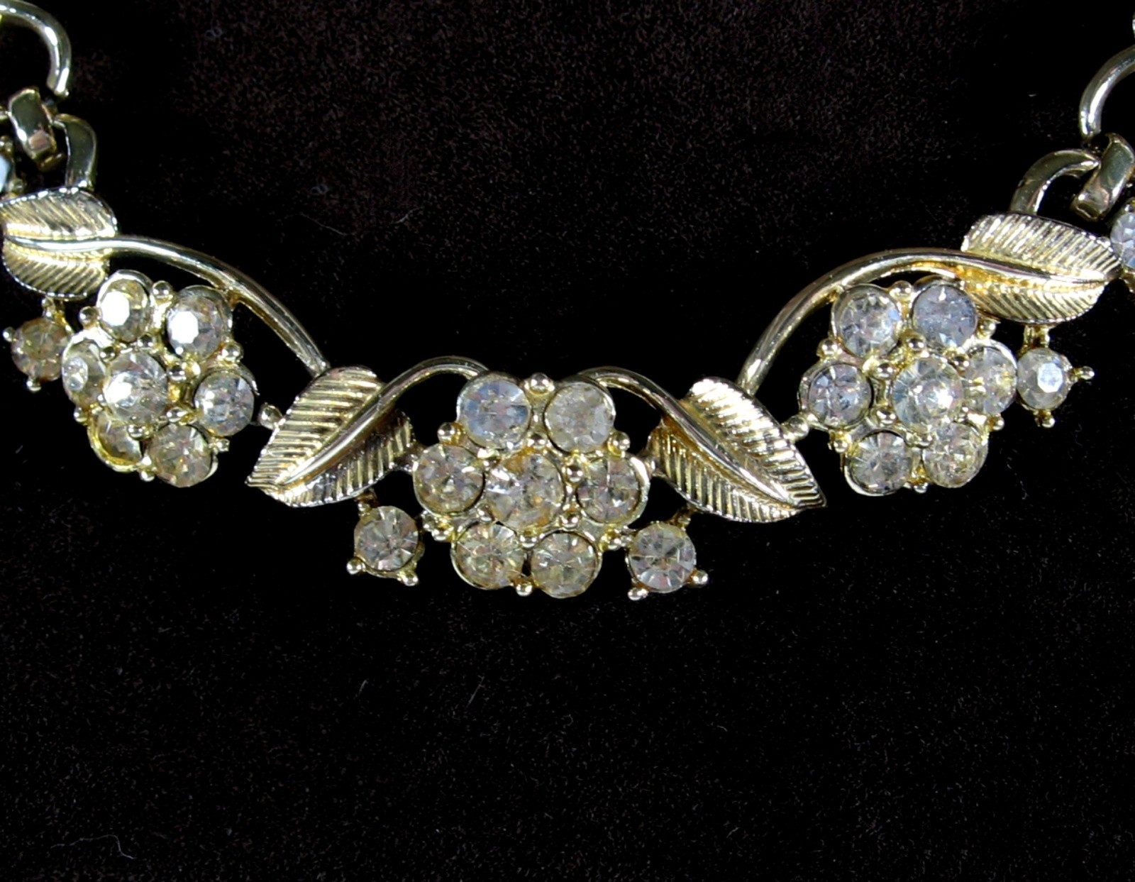 CORO Vintage NECKLACE Rhinestone Flower Blooms Leaves Goldtone Choker 16"