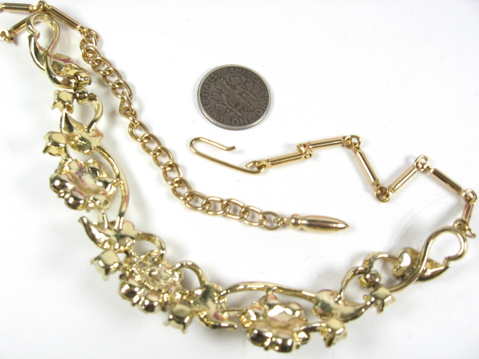 CONDITION: This piece of jewelry is in pre-owned and vintage used condition. The clasp is in full working order. All rhinestones are present. Some of the stones have dulled or yellowed with age. There is scratching and finish wear present.