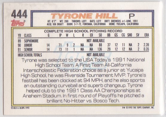 M) 1992 Topps Baseball Trading Card - Tyrone Hill #444
