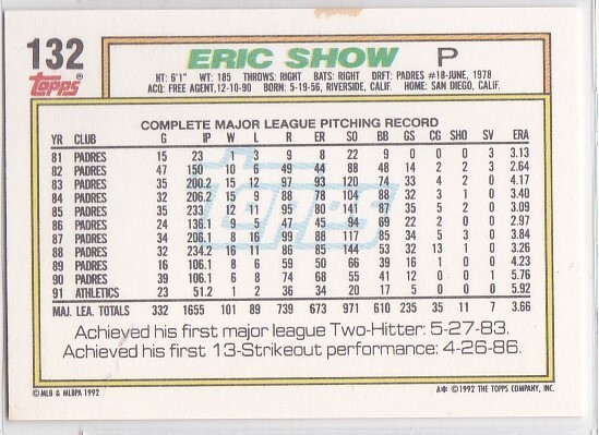 M) 1992 Topps Baseball Trading Card - Eric Show #132
