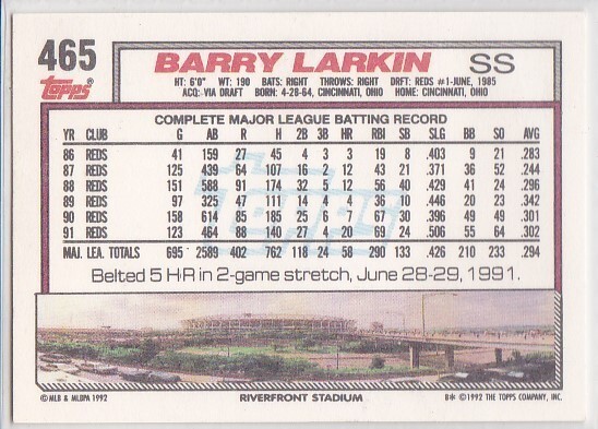 M) 1992 Topps Baseball Trading Card - Barry Larkin #465