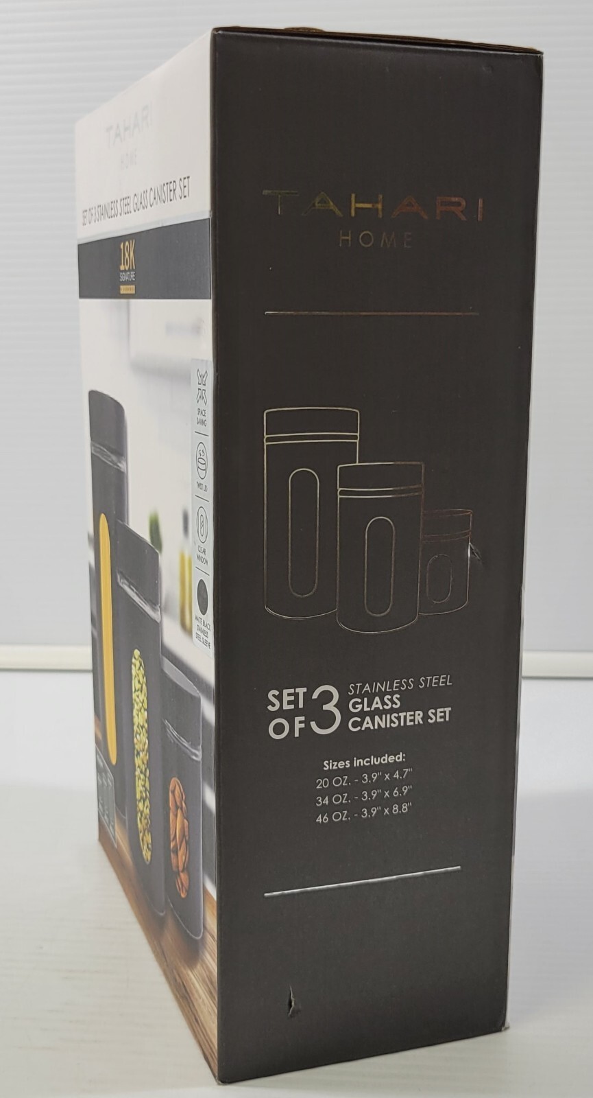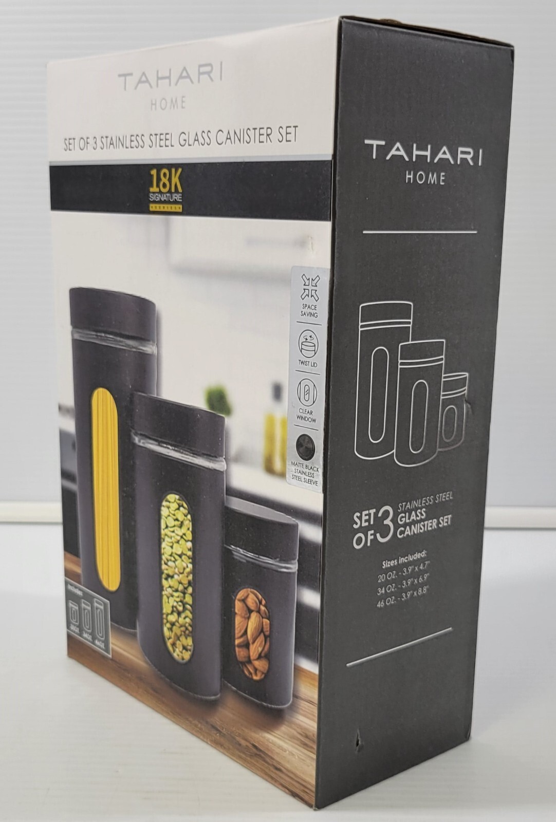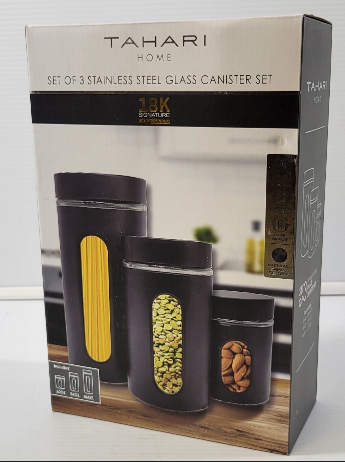 *L) Set 3 Tahari Home Signature Stainless Steel Glass Black Canister 17TS124BK
