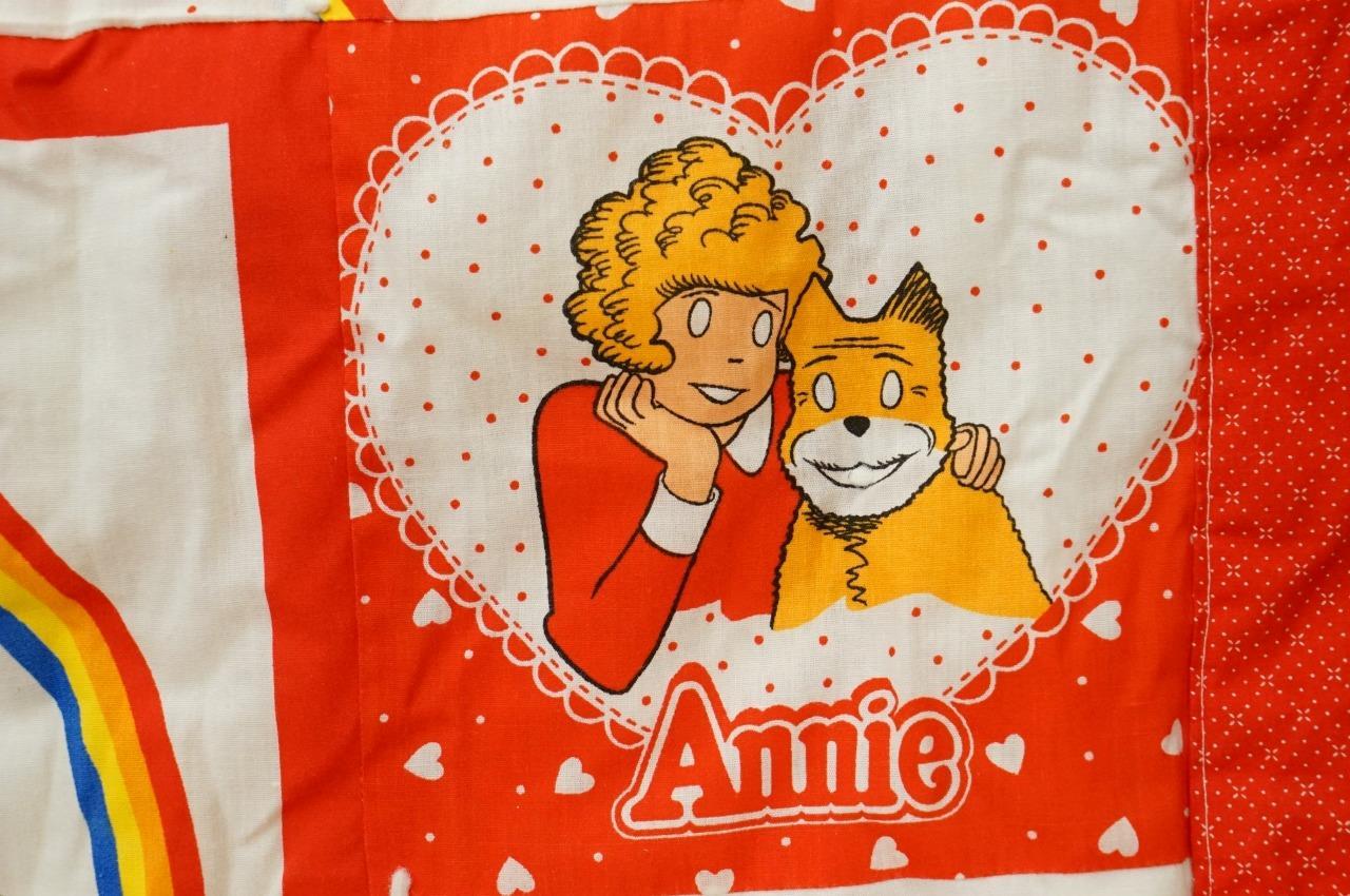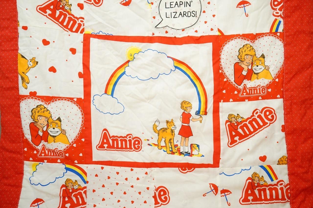 Vintage Kids Tacked Quilt Classic Comic Book Annie Cartoon Cotton Print Blanket. Measures 36" by 48" Hand crafted. Machine and hand stitching. No smoke or pet odors.